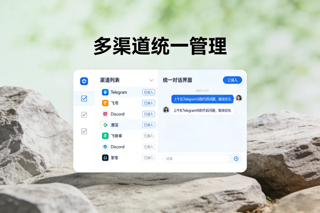 你在 Telegram 上和 ChatGPT 聊天,在飞书里用企业 AI,在浏览器里打开 Claude。每个渠道都是独立的,对话历史不互通,配置各不相同。