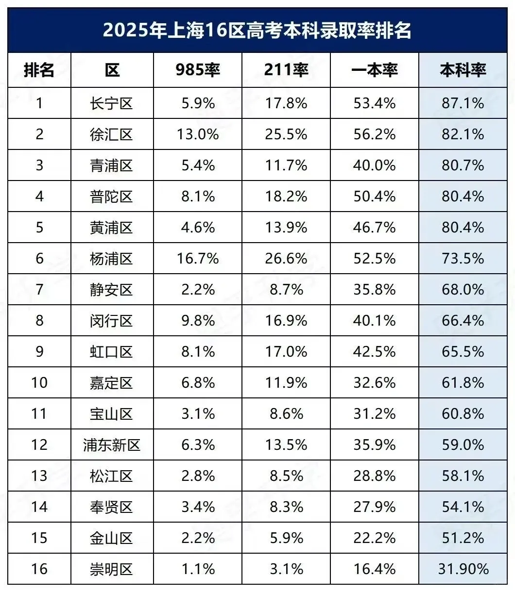 前几天正好翻到一组2025年上海各区的高考数据,挺有意思的。