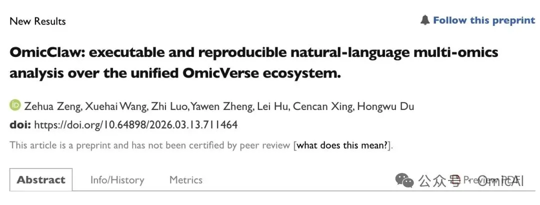 论文已在BioRxiv上预印:“OmicClaw: executable and reproducible natural-language multi-omics analysis over the unified OmicVerse ecosystem”。