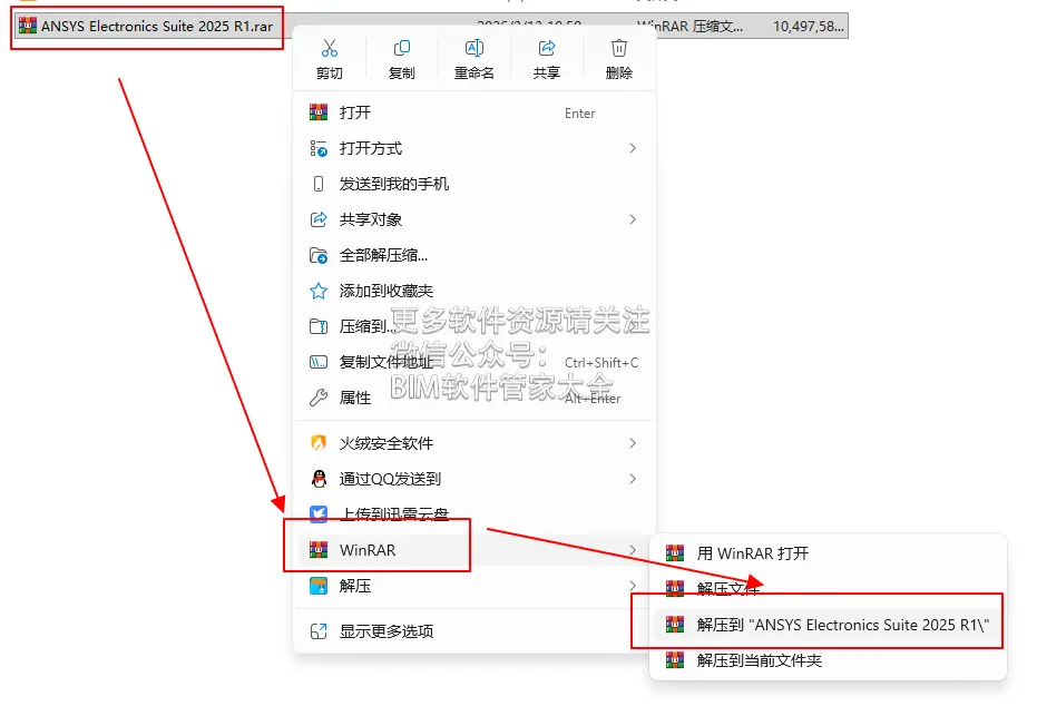 1、鼠标右键选择下载的好的安装包【ANSYS Electronics 2025 R1】,然后选择【解压到“ANSYS Electronics 2025 R1“】进行解压。(下载软件安装包之前务必将杀毒软件以及防火墙关闭,避免将破解补丁或注册机删除)