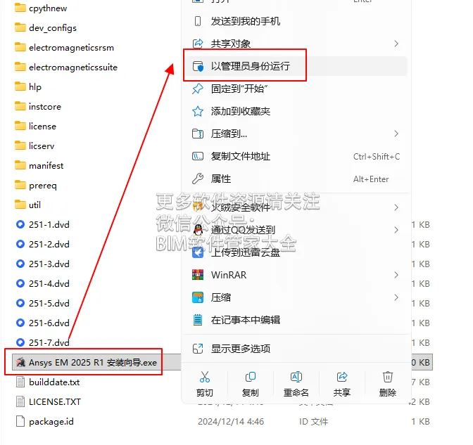 3、打开刚刚解压的文件夹,双击打开“Ansys EM 2025 R1”文件夹,鼠标右键点击“Ansys EM 2025 R1 安装向导.exe”选择“以管理员身份运行”。