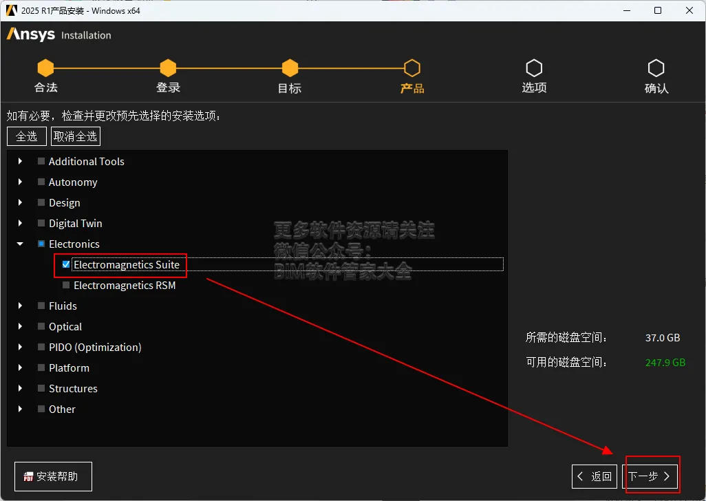 9、此安装包只包含电磁仿真相关的内容,所以只能勾选Electronics下的安装项,点击“下一步”,其它的选项全部取消勾选。