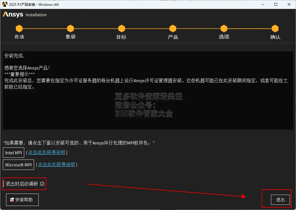14、取消勾选“退出时启动调研”(蓝色字变成白色即为取消),点击“退出”