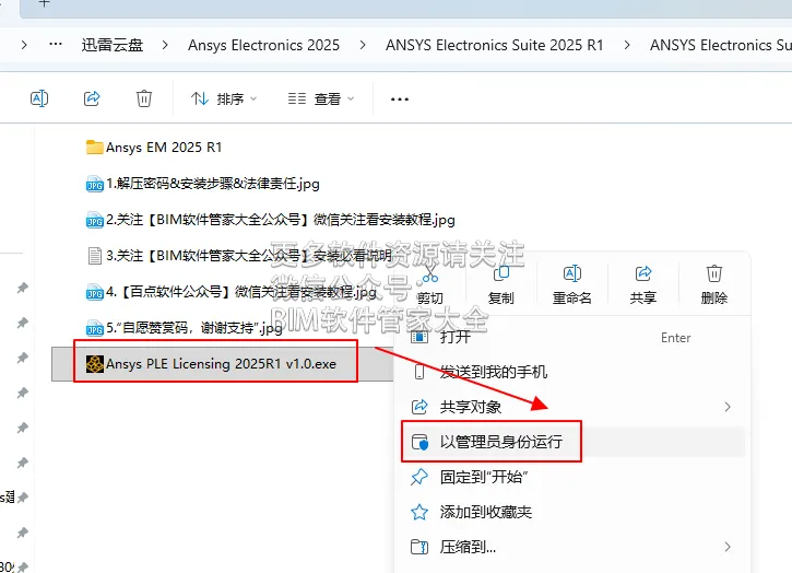 16、返回之前解压的“ANSYS Electronics Suite 2025 R1”文件夹,选中该文件夹下的“Ansys PLE Licensing 2025R1 v1.0.exe”文件,鼠标右键选择“以管理员身份运行”