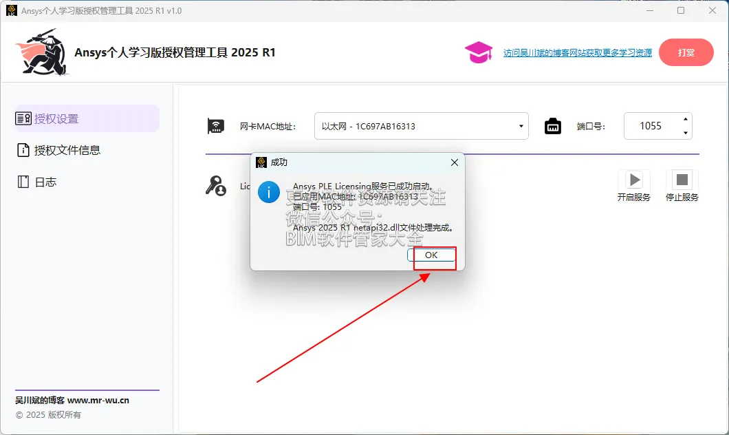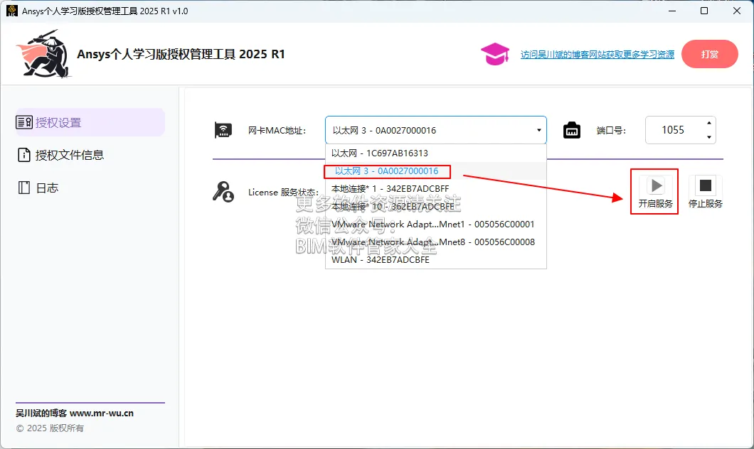 25、工具会自动扫描并列出所有可用的网卡MAC地址,并自动识别出物理网卡MAC地址,选择正在使用的网卡MAC地址(以太网代表网线联网,WLAN代表WIFI联网),本教程选择“以太网…”,点击“开启服务“