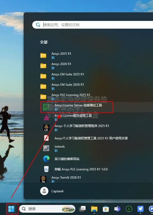 27、点击“开始“菜单栏,点击展开“Ansys PLE Licensing 2025 R1“,点击打开“Ansys License Server连接测试工具“