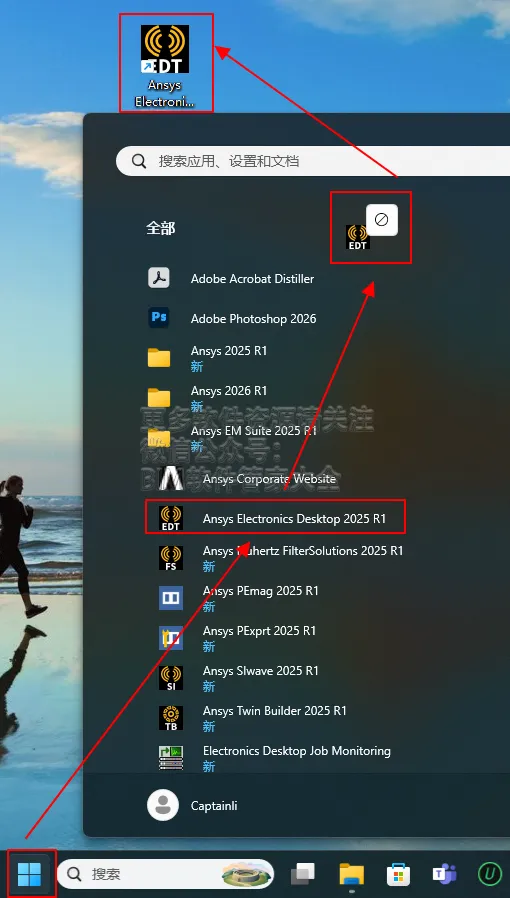 30、点击“开始“菜单栏,点击展开“Ansys PLE Licensing 2025 R1“,找到“Ansys Electronics Desktop 2025 R1“软件,鼠标左键拖拽到桌面上即可创建桌面快捷方式