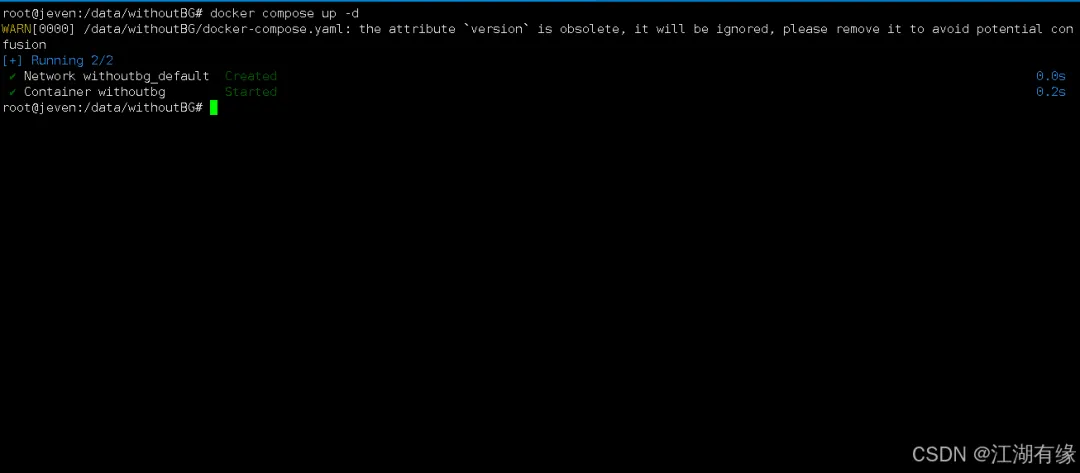root@jeven:/data/withoutBG# docker compose psWARN[0000] /data/withoutBG/docker-compose.yaml: the attribute `version` is obsolete, it will be ignored, please remove it to avoid potential confusion NAME IMAGE COMMAND SERVICE CREATED STATUS PORTS withoutbg withoutbg/app:1.2 "python -m uvicorn b…" withoutbg 30 seconds ago Up 30 seconds (healthy)0.0.0.0:7600->80/tcp, [::]:7600->80/tcp