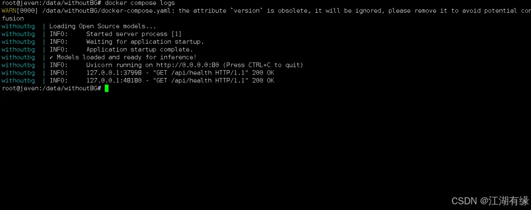 root@jeven:/data/withoutBG# docker compose logsWARN[0000] /data/withoutBG/docker-compose.yaml: the attribute `version` is obsolete, it will be ignored, please remove it to avoid potential confusion withoutbg | Loading Open Source models... withoutbg | INFO: Started server process [1]withoutbg | INFO: Waiting for application startup. withoutbg | INFO: Application startup complete. withoutbg | ? Models loaded and ready for inference!withoutbg | INFO: Uvicorn running on http://0.0.0.0:80 (Press CTRL+C to quit)withoutbg | INFO: 127.0.0.1:37998 - "GET /api/health HTTP/1.1"200 OK withoutbg | INFO: 127.0.0.1:48180 - "GET /api/health HTTP/1.1"200 OK