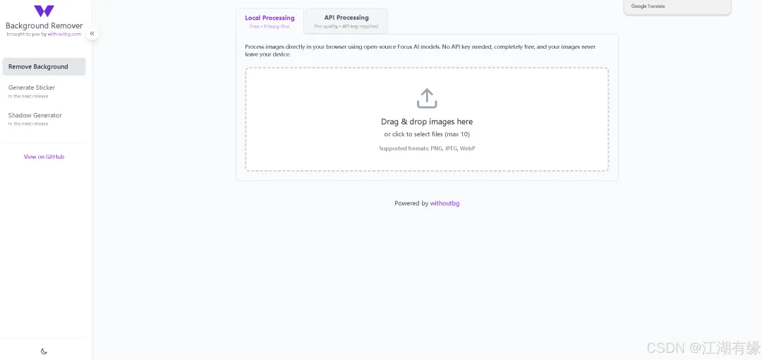 或调用 withoutBG Pro 托管 API 获取更高精度结果。 - 专业级图像质量