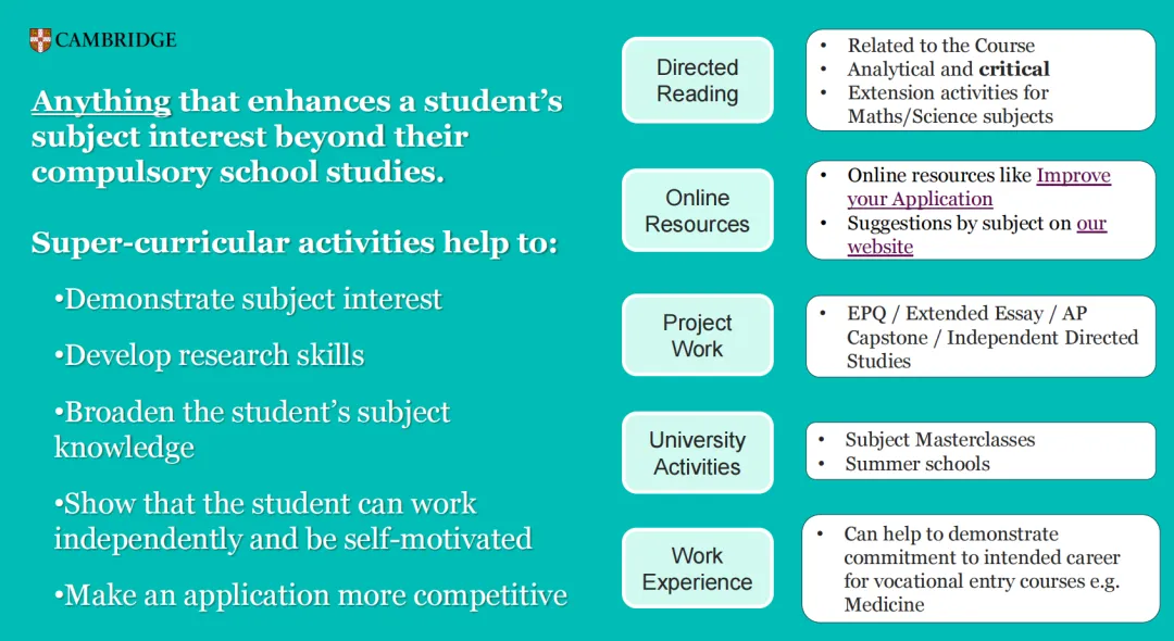 英国大学看重学生的学术潜力与专业热情,课外活动建议优先选择与未来专业强关联、能服务学术提升的活动——这正是Super-curricular(超级课外活动)。剑桥大学在官方《课外活动指南》中,列举此类活动实例时便特别提到夏校(Summer School)。