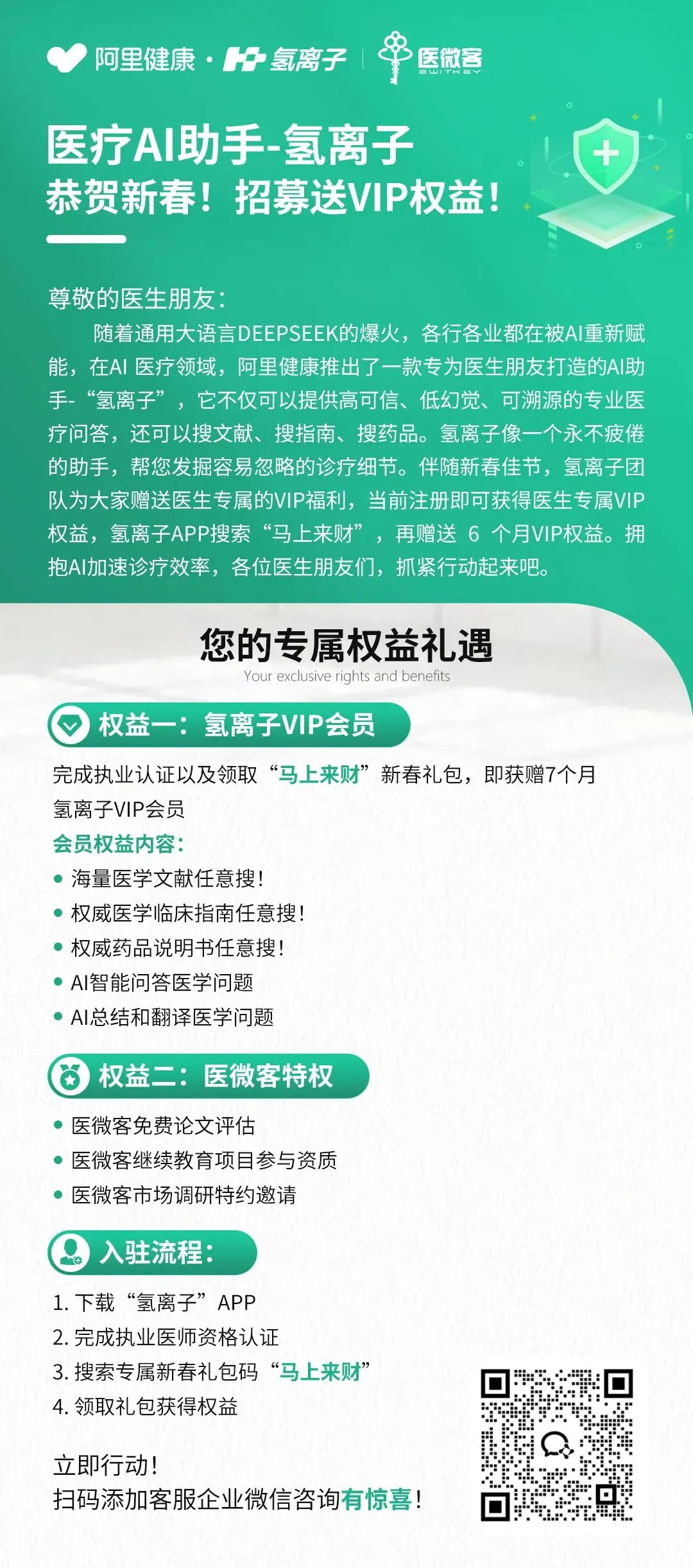 医疗AI助手-氢离子,携手医微客,注册送VIP权益 声明:本文章旨在传递更多信息,版权归原作者所有。原创文章转载均需经过授权并注明来源,如涉及内容、版权或其他问题请时联系小编删除!文章仅代表作者个人观点,并不代表公众号立场。本公众号拥有对此声明的最终解释权! 添加医微客小编微信(微信号:ewkey1),享受研究方案、数据报告、SCI文章免费评估服务。
