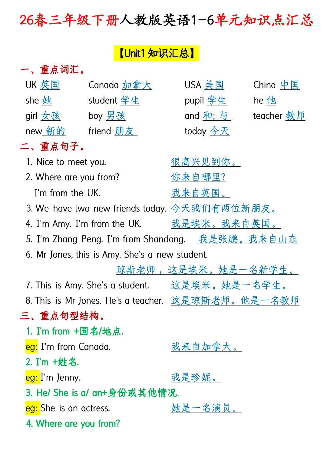 26春三年级人教PEP英语🔥1-6单元核心知识点清单