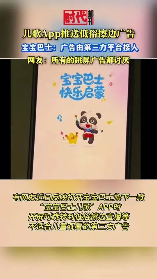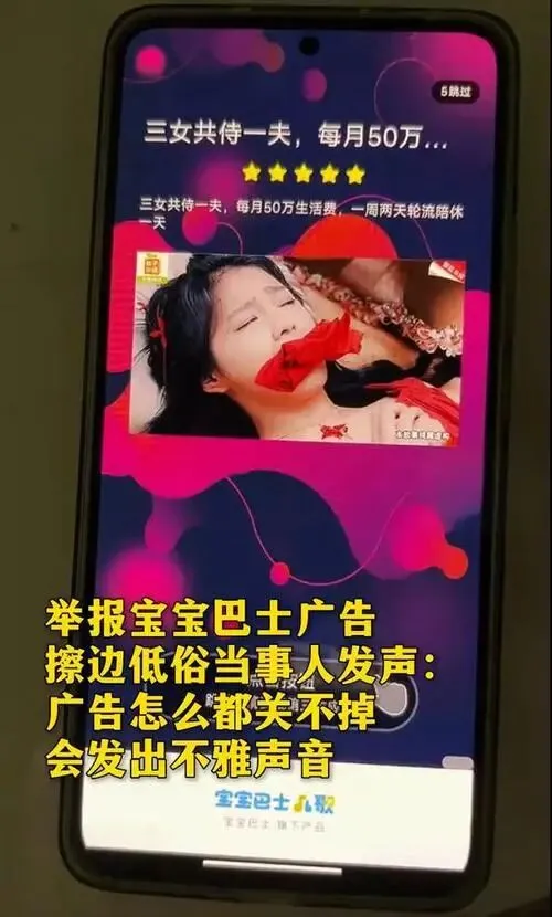 据澎湃新闻的消息,2025年10月,有位家长在网上吐槽说,本来想打开宝宝巴士儿歌APP让孩子听几首儿歌,结果倒好了,屏幕上突然蹦出来一条低俗广告,写着“三女共侍一夫,每月50万生活费!”