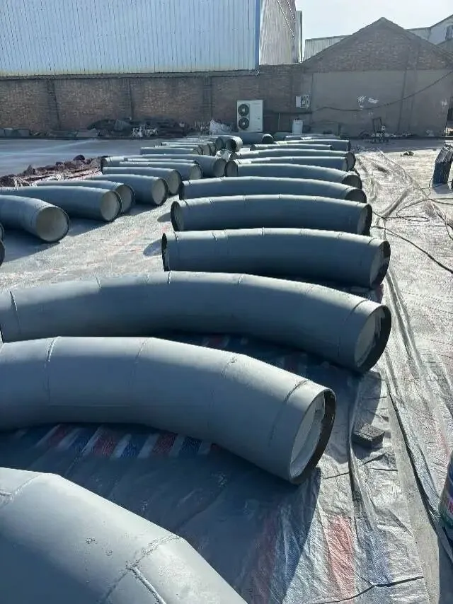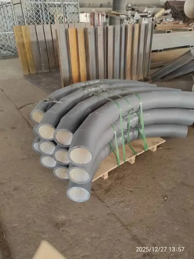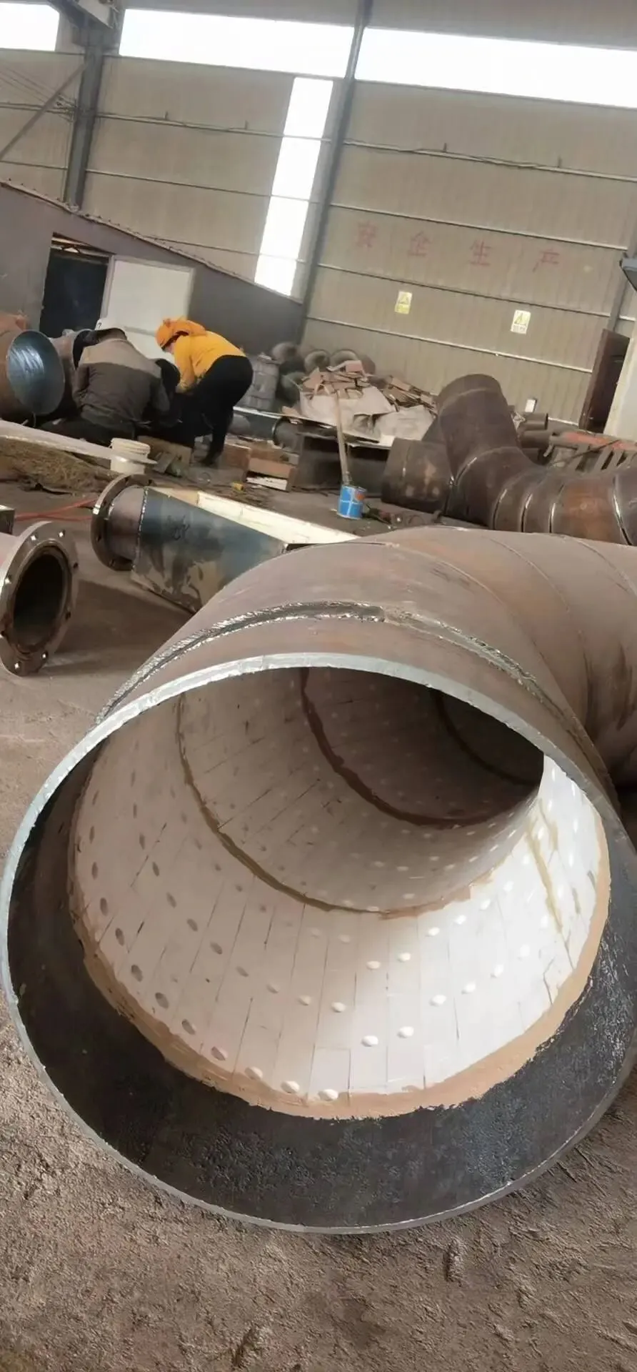 主体管件焊接工序全部完成后,开展内壁耐磨陶瓷片衬装作业,陶瓷片厚度统一为10mm,采用紧密贴合式铺贴工艺,确保陶瓷片与管件内壁粘接牢固、拼接无缝,无空鼓、脱落隐患。重点把控弯头部位衬瓷质量,衬瓷完成后弯头内壁弧面依旧圆滑规整,维持原有流畅弧度,既最大化增强内壁耐磨性能,延长管件使用寿命,又不影响粉体正常输送,整体产品结构稳固、耐磨性能优异,适配高磨损工业输送场景。