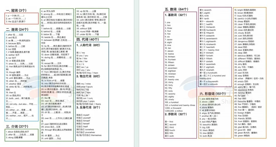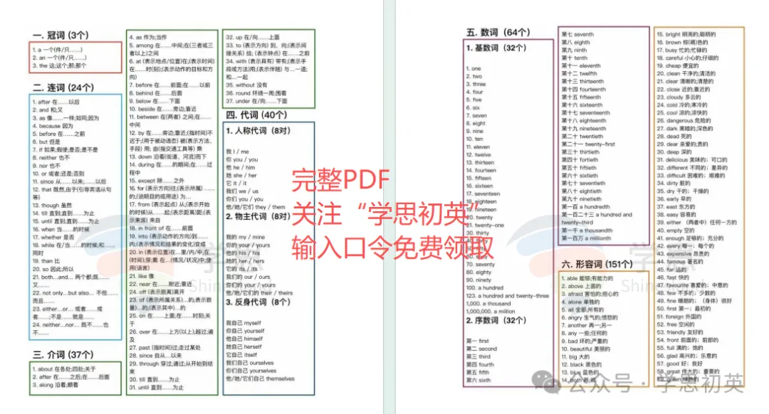 今天给大家整理了一份初中英语必背核心词汇资料(免费领pdf),按词性分类有冠词、连词、数词、名词、介词、代词、副词、动词、形容词九大类,轻松搞定词汇难关~