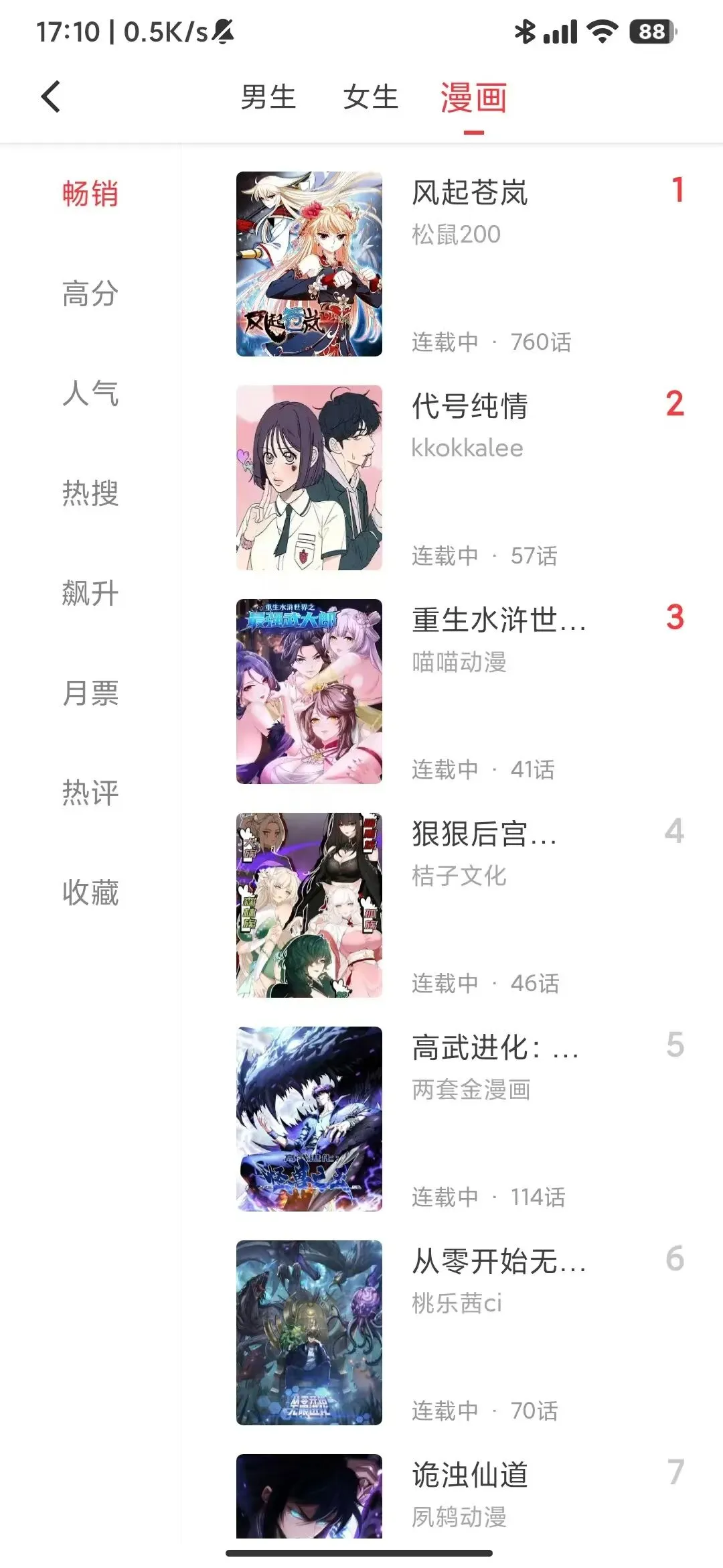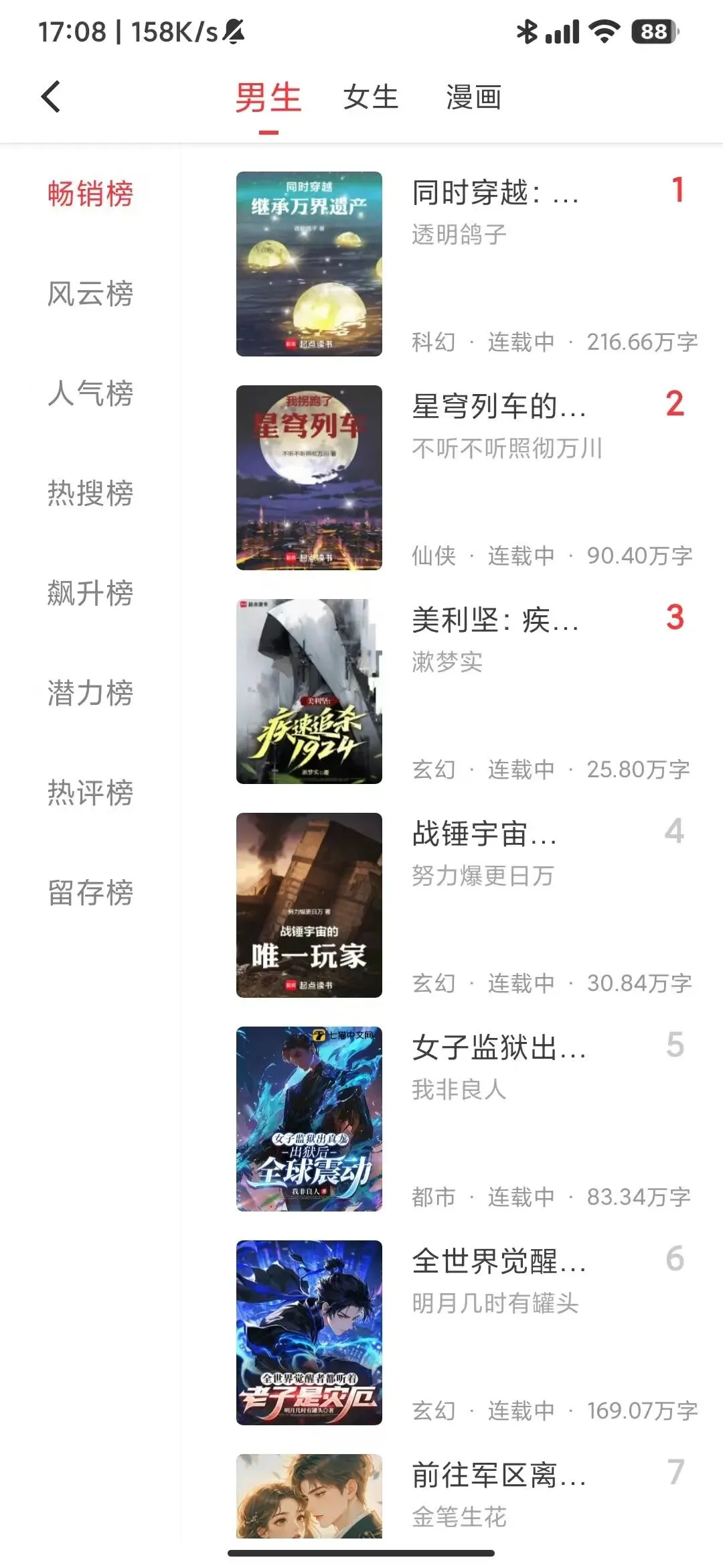 分类非常详细,包含玄幻、武侠、都市、历史、游戏、体育、二次元、短篇、悬疑等,自带评分,还有畅销榜、热度榜、潜力榜、飙升榜、热搜榜、完结榜、好评榜、推荐榜、留存榜等,喜欢什么都可以直接搜索!