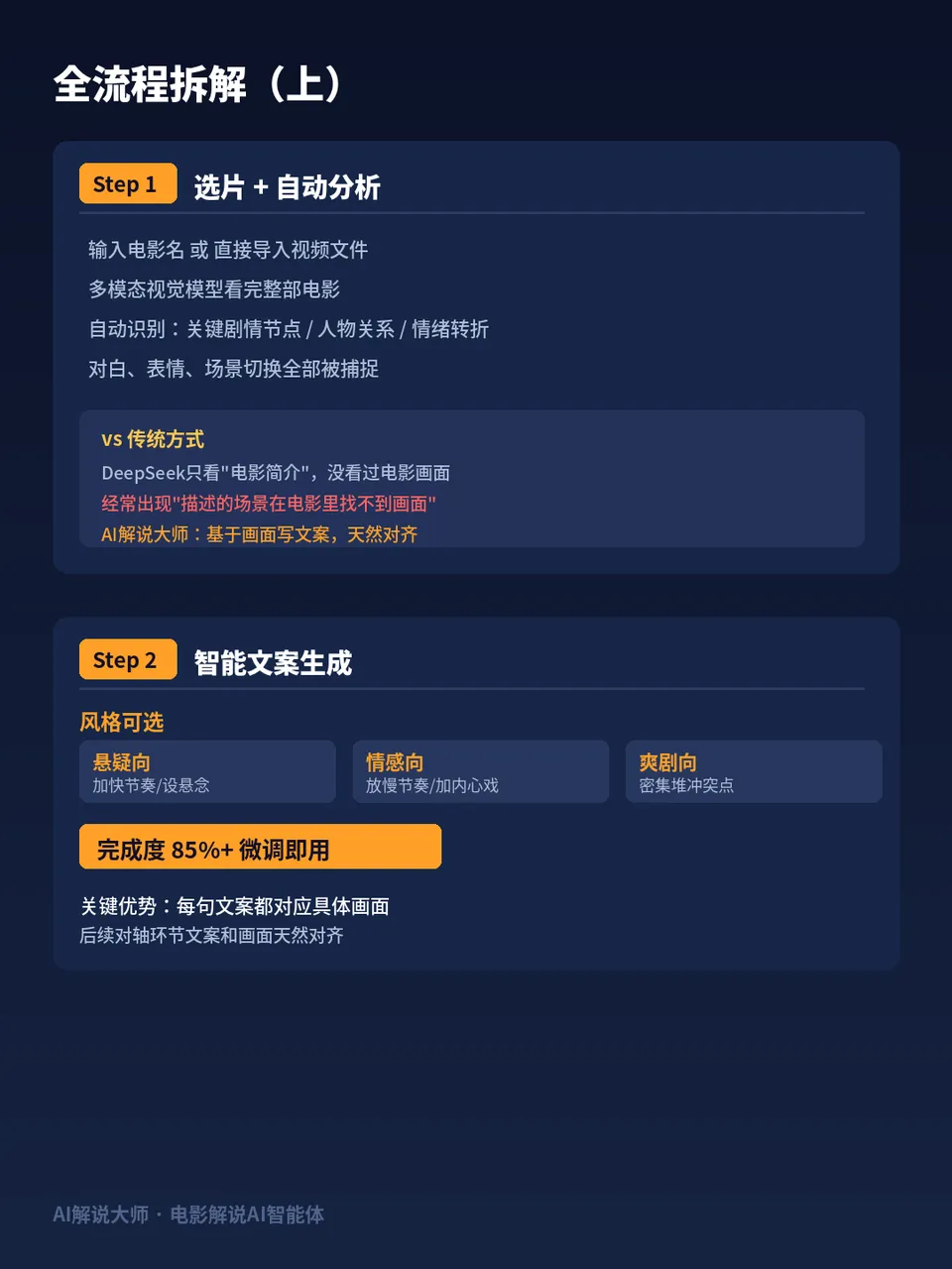 和传统流程对比一下:你用DeepSeek写文案的时候,给它的输入通常是电影名+豆瓣简介+你自己的剧情理解。但AI不管你告诉它多少背景信息,它终究没有”看过”这部电影,所以写出来的文案经常出现”描述的场景在电影里找不到对应画面”的问题。AI解说大师的视觉分析彻底解决了这个痛点。