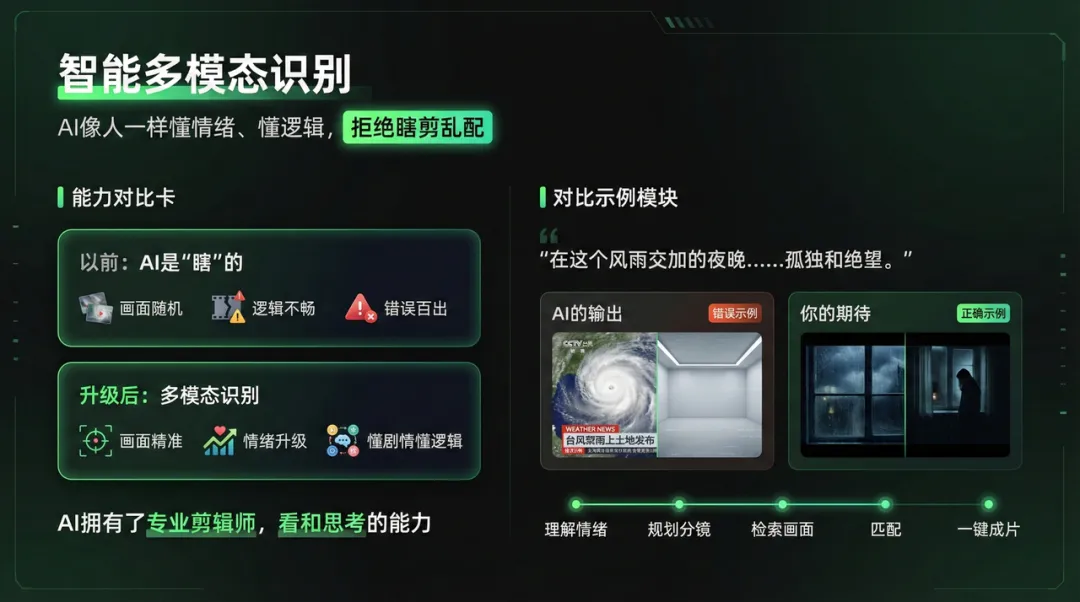 AI解说大师的做法是:利用多模态视觉能力自动识别画面内容,把文案和对应的画面片段自动匹配。因为文案本身就是基于画面内容生成的(回到第一步的视觉分析),所以匹配的准确度非常高。