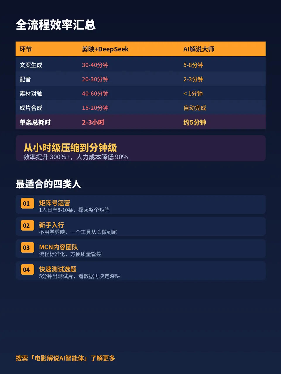 和手动写文案的时间对比:手动用DeepSeek生成+人工润色:30-40分钟AI解说大师智能生成+微调:5-8分钟
