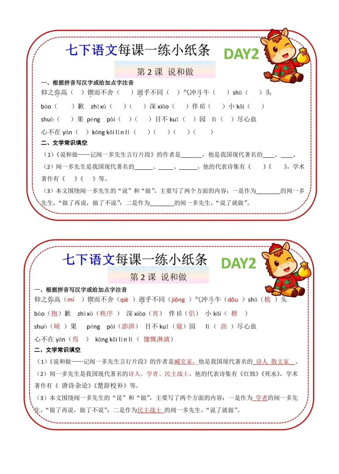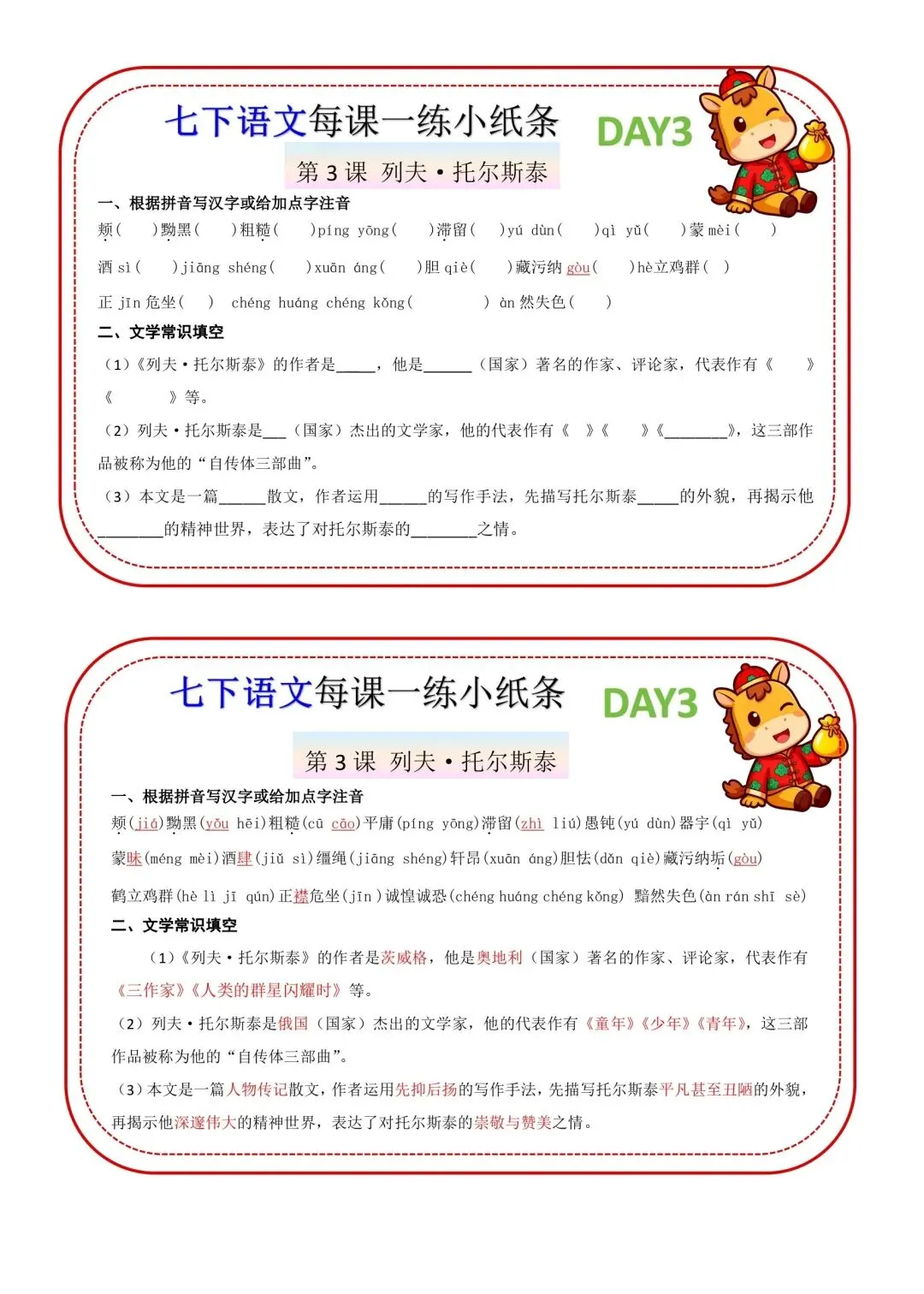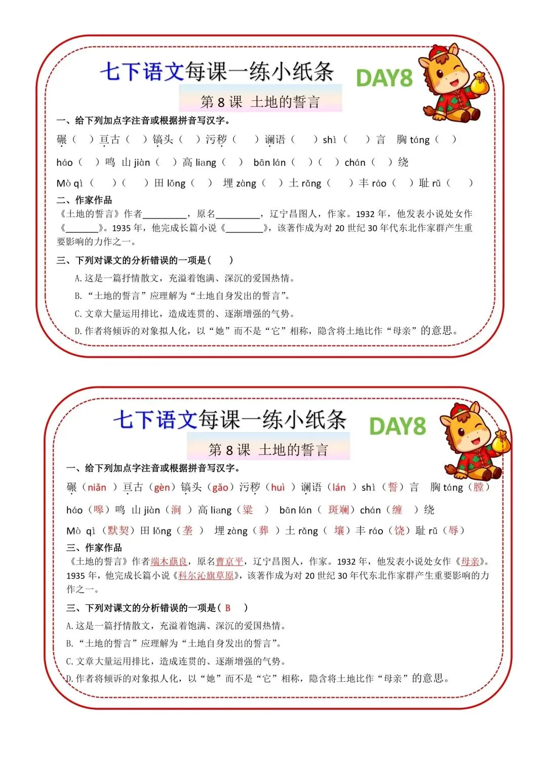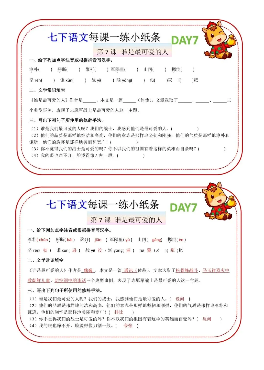 七年级下册语文每课一练小纸条高清电子版可打印