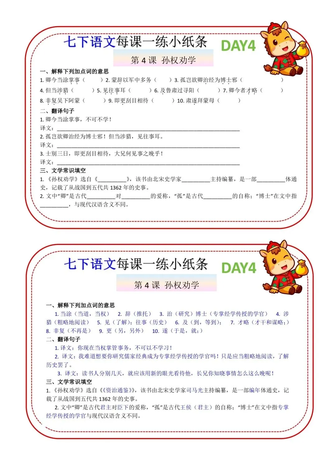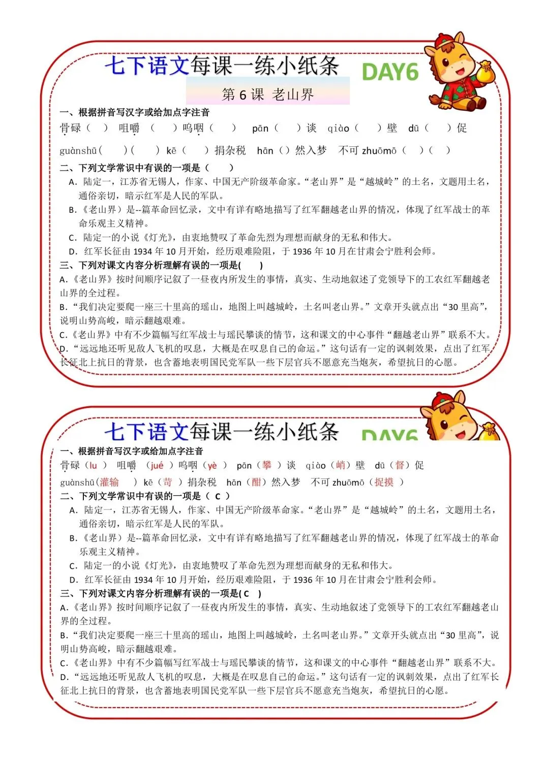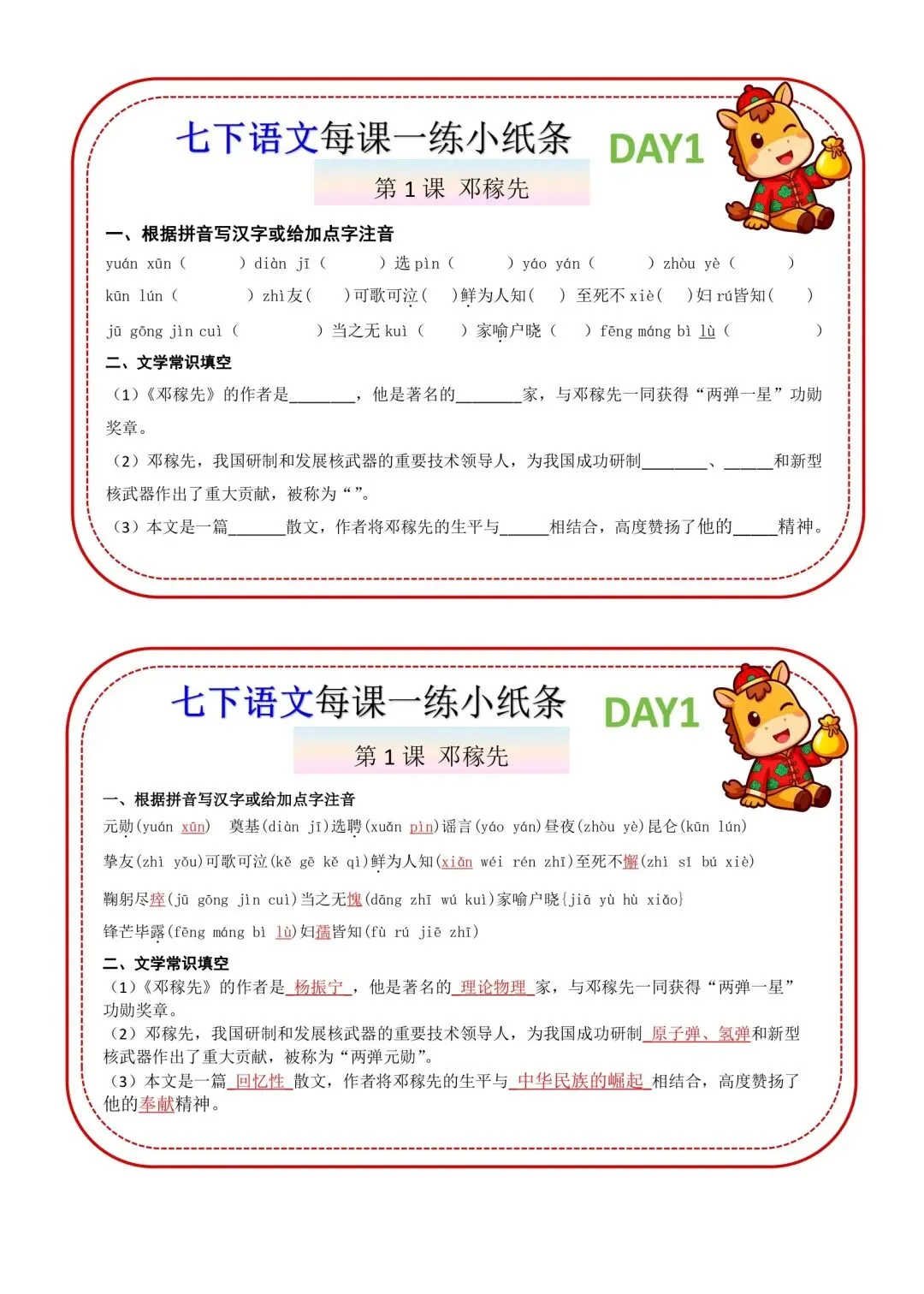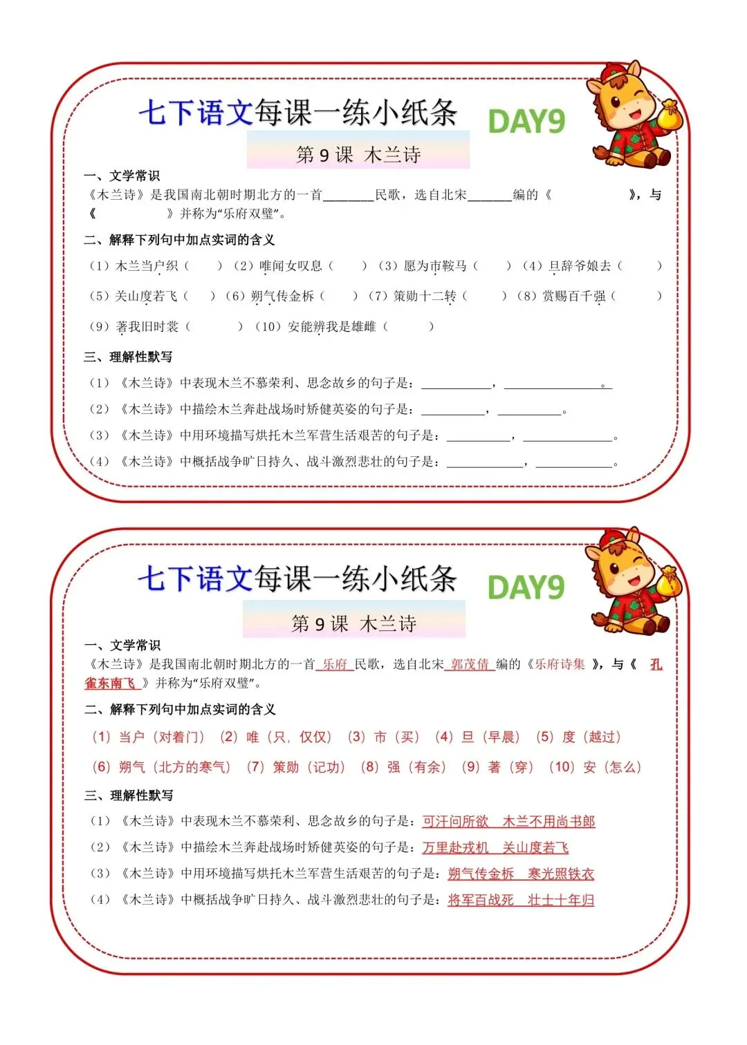 七年级下册语文每课一练小纸条高清电子版可打印