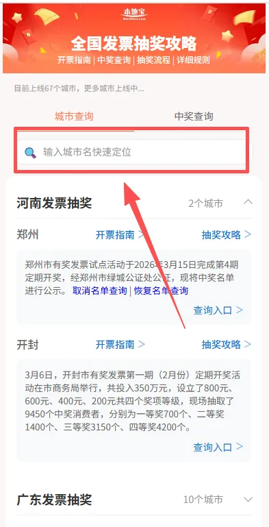 ✅新版:首页上方新增搜索框,直接输入城市名搜索,即可获取抽奖攻略