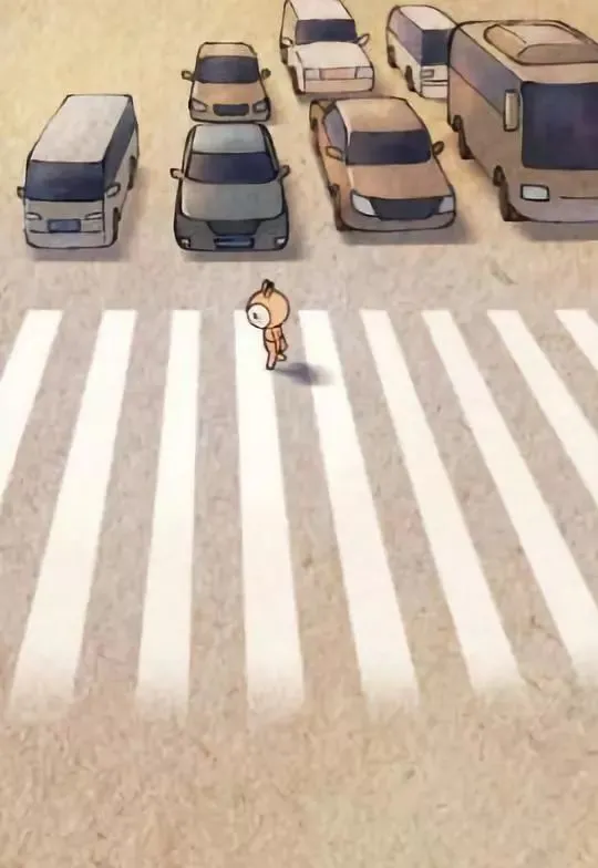 It’s red light, I cross the road alone in front of a row of cars.