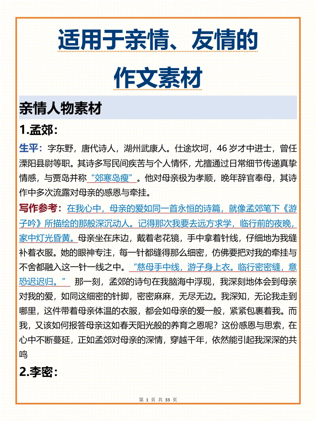 今天给大家整理了中考必备的【适用于亲情、友情的作文素材】,覆盖母爱、父爱、友情等全场景常考话题,附详细素材介绍与写作参考,不管题目如何变式,都能精准应对,轻松拿下高分!