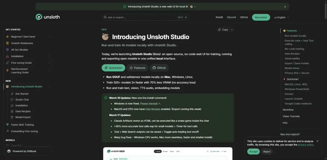 Unsloth近日发布了名为Unsloth Studio的测试版开源无代码网页界面,该工具集成了在本地环境中训练、运行及导出开源模型的功能。该平台支持超过五百种涵盖文本、视觉、语音合成及嵌入的大型语言模型,其核心优势在于训练速度提升两倍且能节省百分之七十的显存,同时确保精度不受损失。用户无需编写代码,仅需上传便携式文档格式、逗号分隔值或结构化数据文件,即可通过内置的数据配方功能自动生成数据集,并在英伟达图形处理器上启动微调。此外,该工具具备自修复的工具调用、实时网页搜索以及代码执行能力,支持运行脚本语言并提供类似沙盒的安全环境,甚至能运行超文本标记语言。为了保障隐私,该程序支持完全离线操作并提供安全验证。目前该工具已适配视窗和开源操作系统,而苹果系统和中央处理器用户暂仅支持聊天推理。用户还能将模型导出为多种兼容格式,以便在其他应用程序接口或推理框架中无缝使用。
