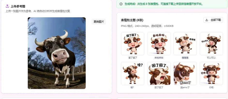 不用你懂设计,不用你蹲AI关键词,只要扔一张参考图进去,一套风格统一的表情包直接生成!
