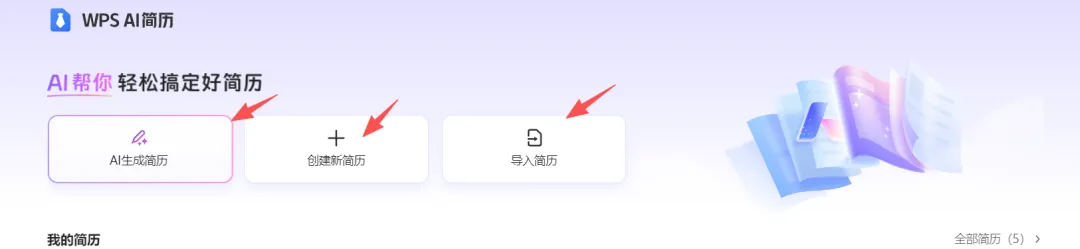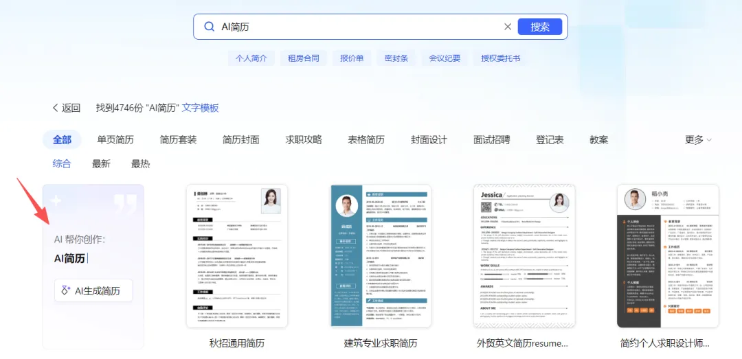 打开WPS,新建文档,在输入框搜索【AI简历】,然后可以选择直接AI生成,或者上传已有的文档,最后可以选择【问答创建】或者【快速生成】。