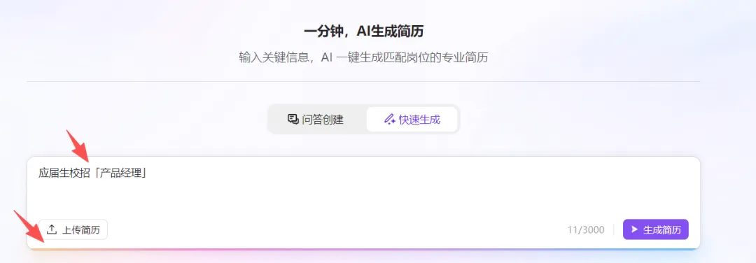 以快速生成进行演示,在对话框输入提示词(身份和应聘的岗位等基本信息),点击【生成简历】即可。