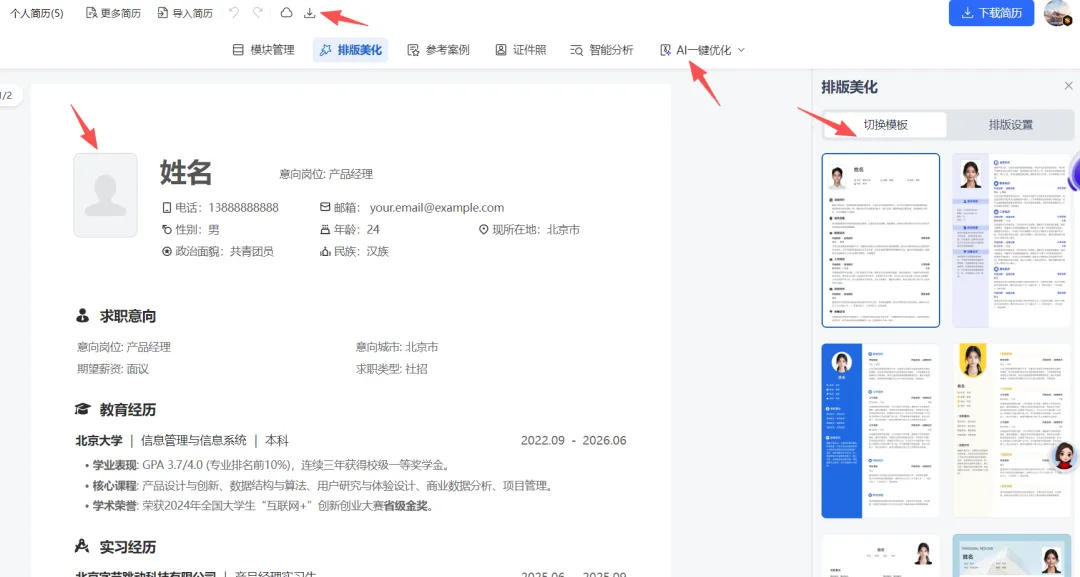 简历生成后,可以进行编辑修改,上传自己的照片,选择合适的模版,改好后点击下载即可。