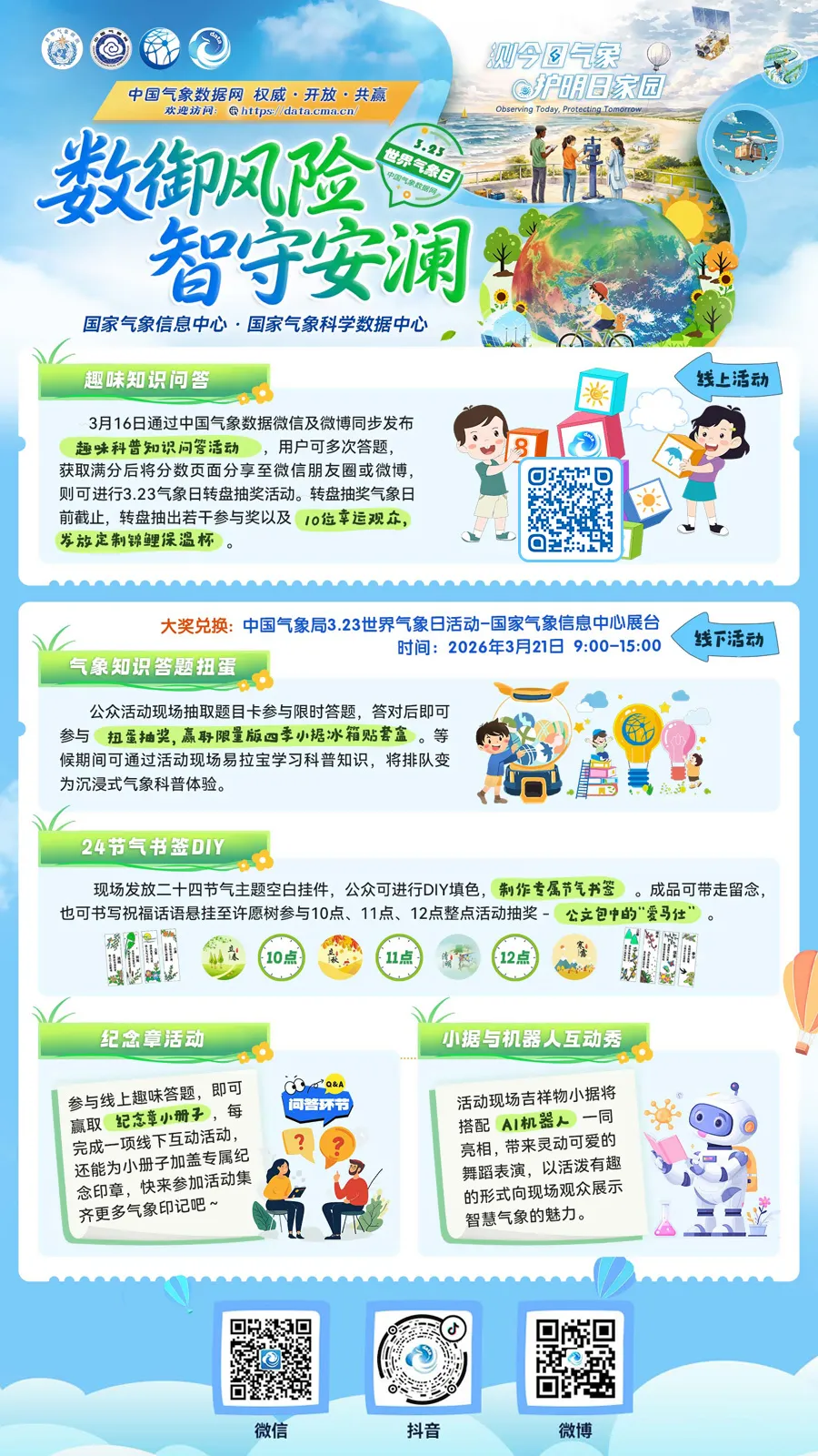 数御风险,智守安澜!国家气象信息中心邀您共赴2026年世界气象日:线上开展微博话题互动、趣味知识问答;另外,线下推出气象答题扭蛋、24节气书签DIY、纪念章打卡及机器人互动秀,以数据赋能防灾,用智慧守护家园。
