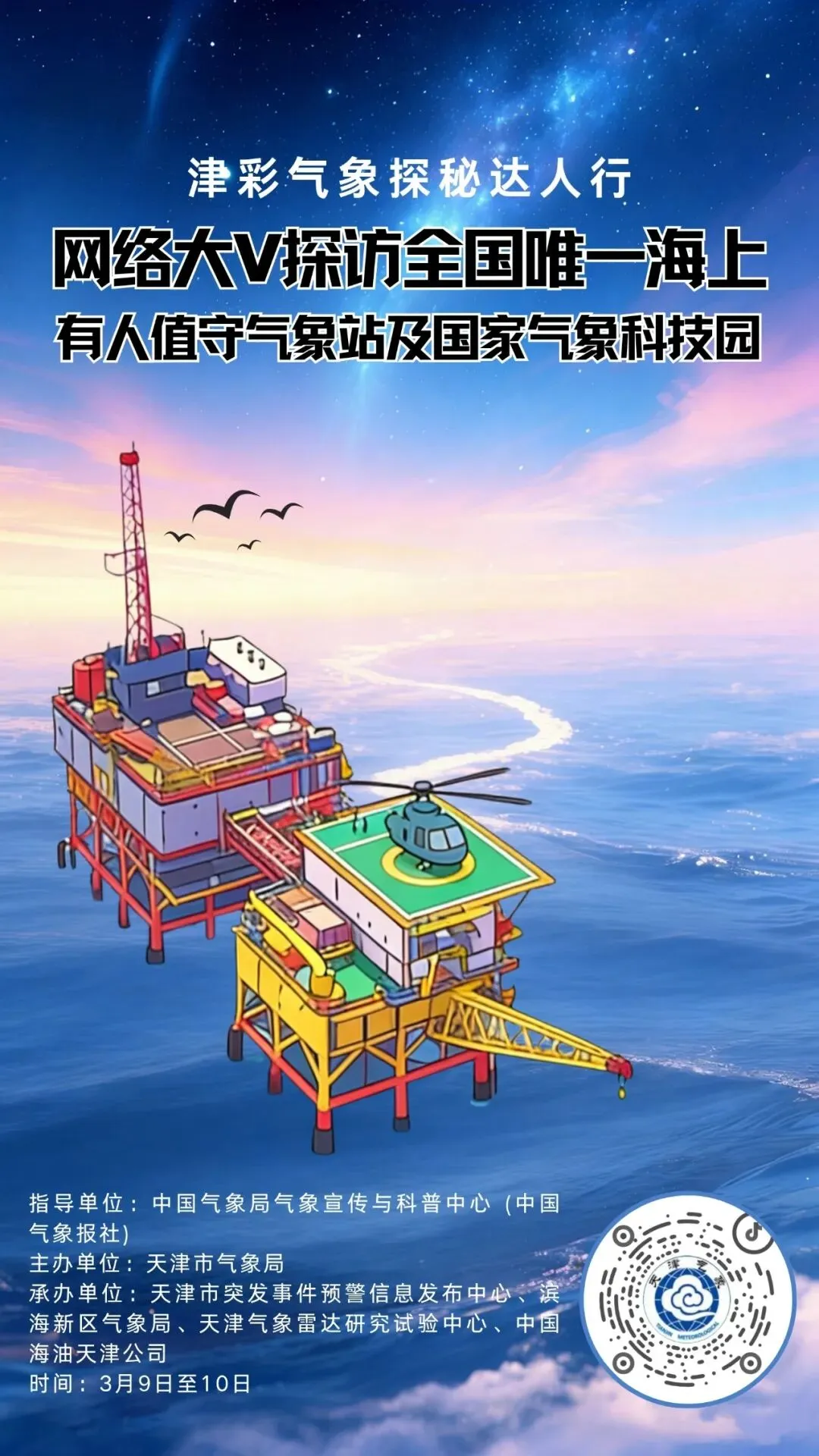 天津市气象局举办“津彩气象探秘达人行”新媒体科普宣传活动,邀请多位具有百万级粉丝新媒体达人登上渤海A平台国家基本气象站,合作共创兼具知识性、趣味性和传播力的科普作品。