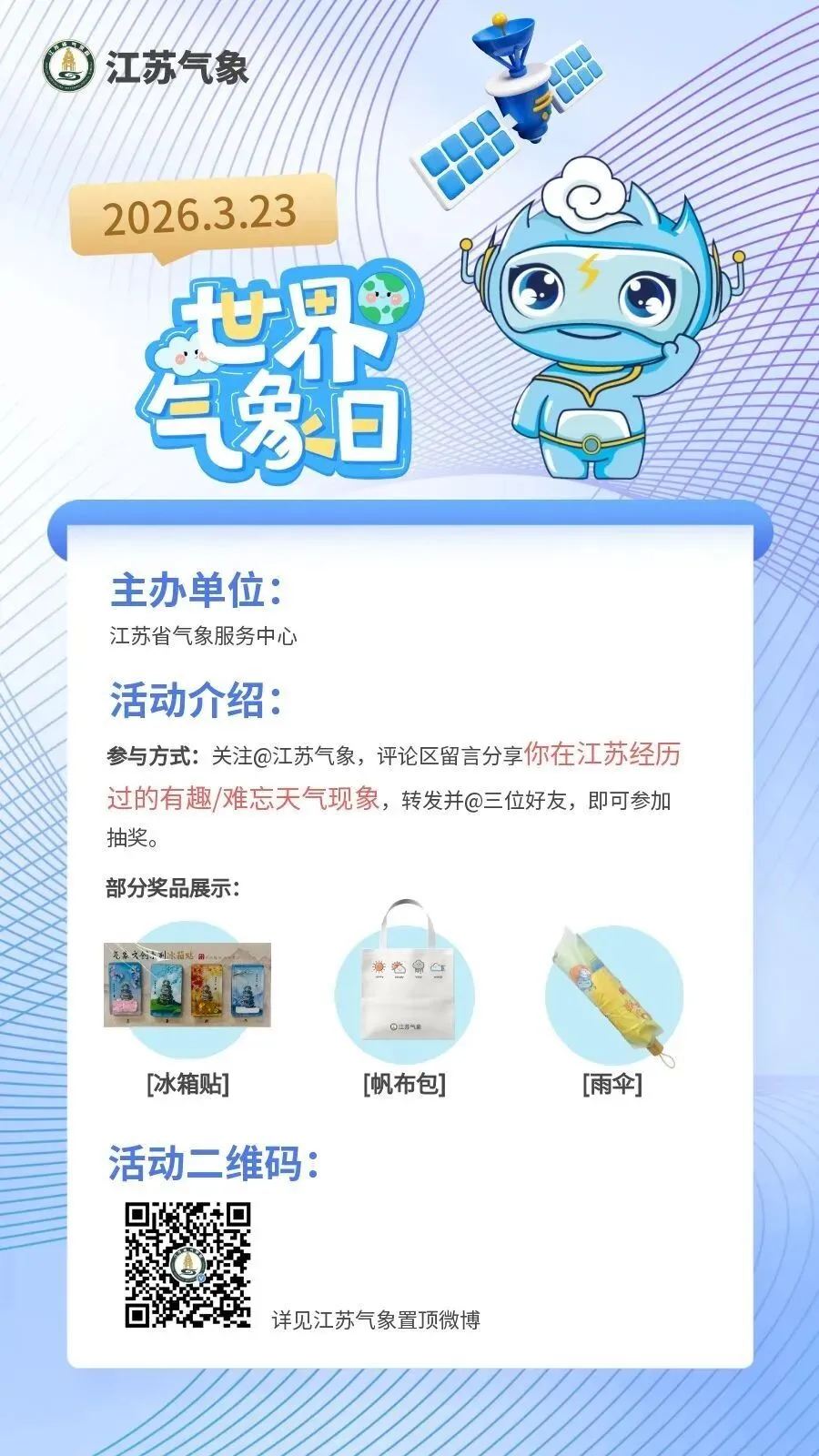 江苏省气象服务中心契合2026年世界气象日主题,通过“江苏气象”官方微博策划线上互动活动。活动设置每日气象知识答题环节,以趣味问答普及防灾减灾知识;同步征集网友在江苏亲历的趣味或难忘的天气故事,深挖气象与生活的紧密关联,参与者有机会赢取“苏苏”主题定制文创产品。