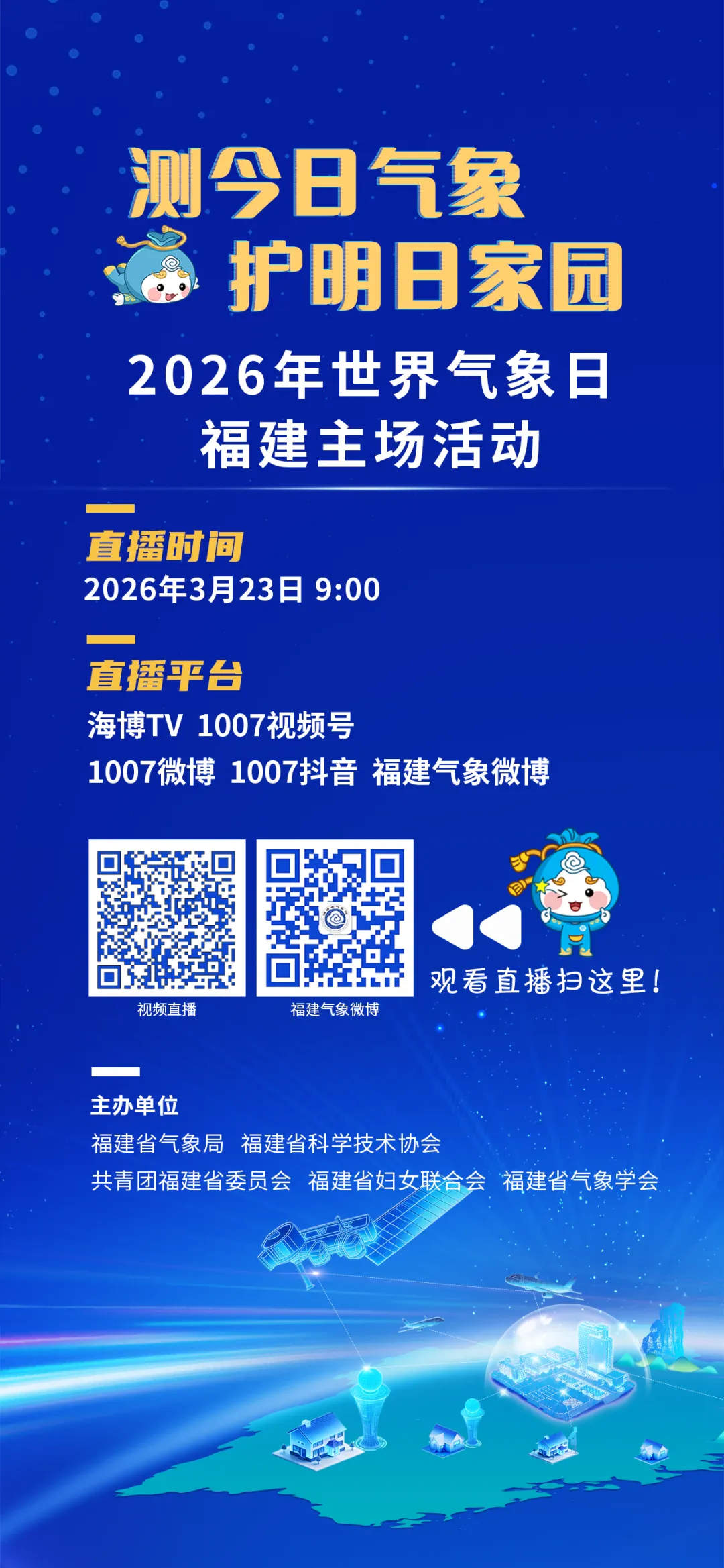 2026年世界气象日福建主场活动于3月23日在福州举办。活动通过直播形式展现,结合妈祖文化与气象防灾减灾理念,展示福建“陆、海、空、天”一体化综合观测体系与 “1262” 防灾减灾工作体系,通过情景剧、诗歌朗诵、青年倡议、“福气妈妈” 巾帼志愿服务启动、”福建省全景式气象监测站网”图谱介绍等环节,彰显气象人精准监测、精细服务、守护八闽家园的使命担当。