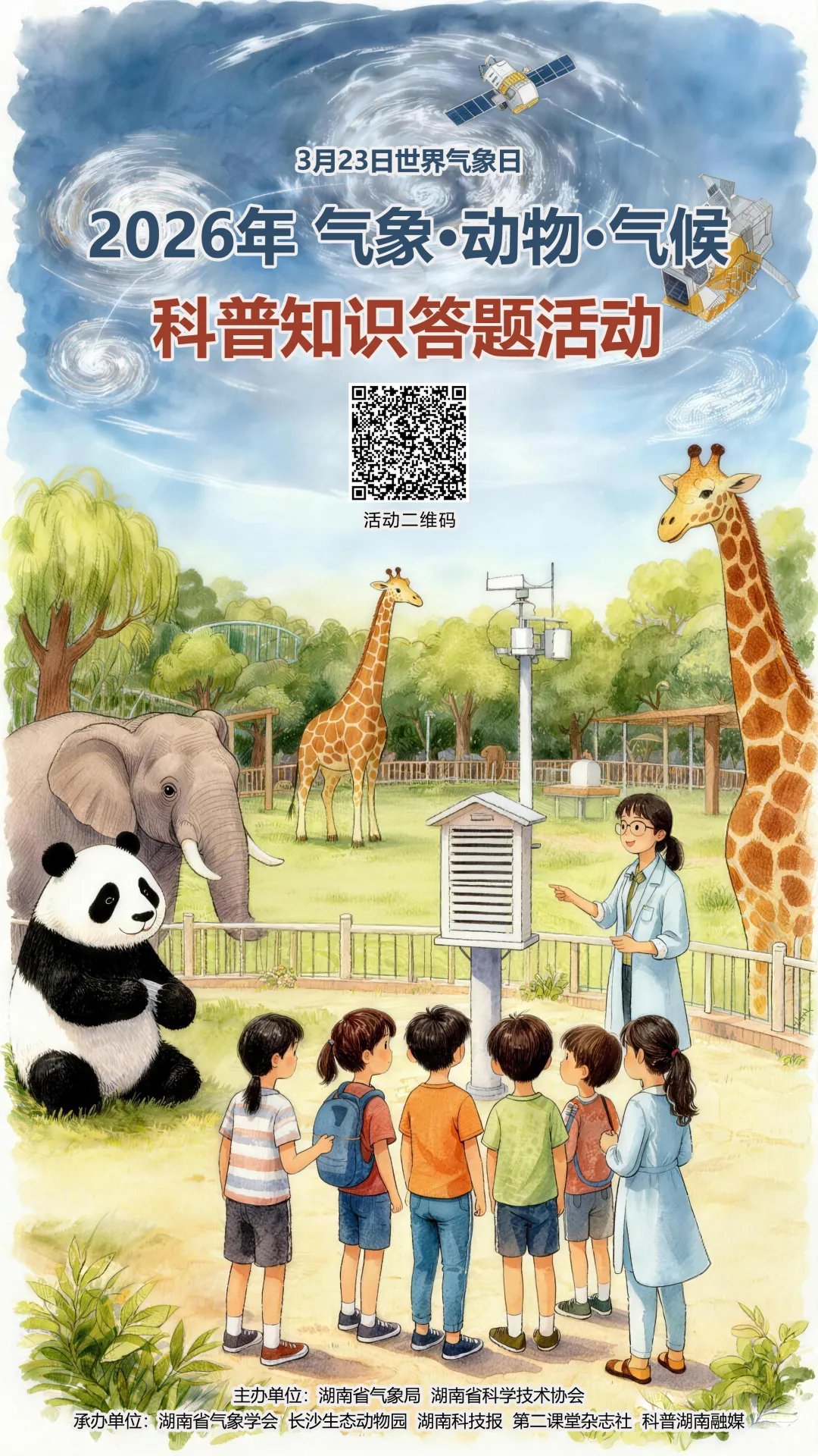 为让广大公民了解气象防灾减灾、气候变化等科普知识,树立气象意识、气候环境保护意识和防灾减灾意识,积极参与防灾减灾工作,湖南省气象局联合湖南省科学技术协会推出“2026年气象·动物·气候科普知识答题活动”,单次答题成绩达到80分,答题系统会自动颁发综合社会实践活动荣誉证书。