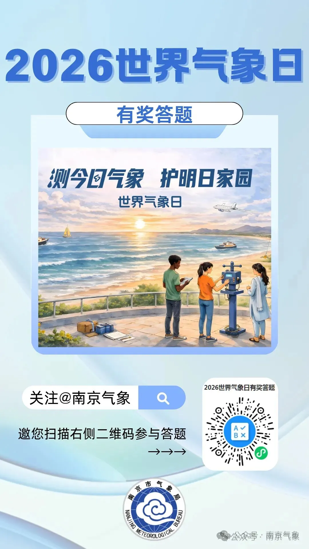 3月16日至23日,南京气象邀请您参与气象知识有奖答题。本次答题主要围绕世界气象日知识、气象防灾减灾知识以及气象法知识三大主题,抽奖结果将于3月24日在南京气象官方微信公布,欢迎大家积极参与。