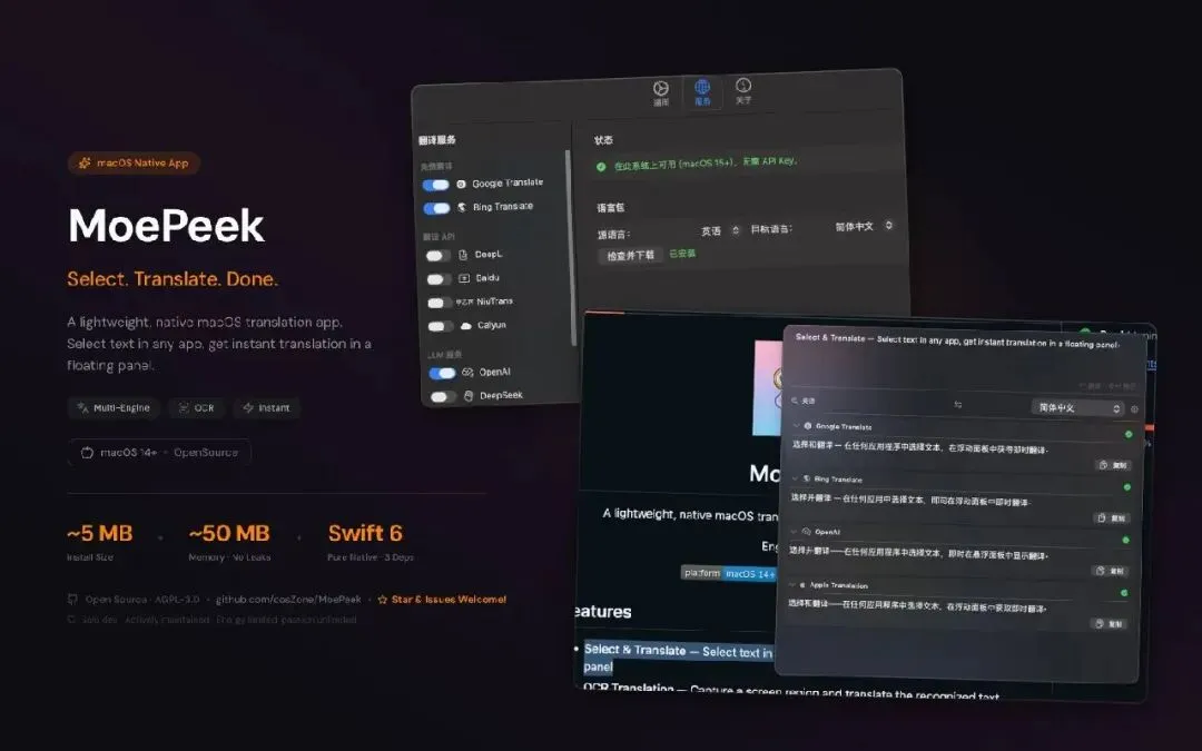 摘要:还在为 Mac 上臃肿的翻译软件发愁?今天推荐一款“极致轻量”的翻译工具——MoePeek。纯 Swift 6 构建,仅 5MB 体积,内存占用低至 50MB。支持划词翻译、OCR 截图翻译,而且完全本地运行,隐私无忧!