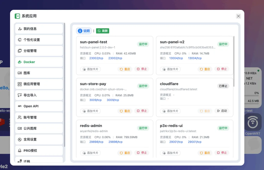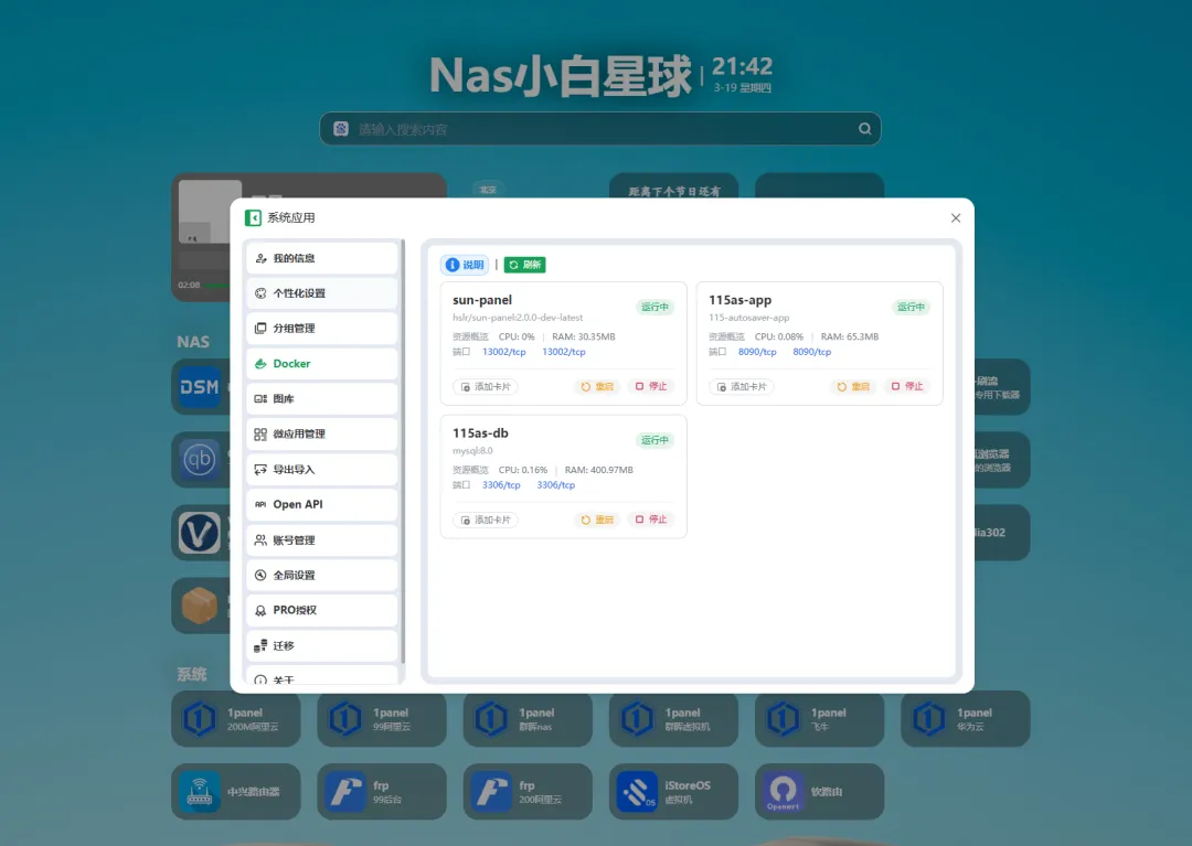 Sun-Panel内置了系统状态监控功能,CPU、硬盘、内存的使用情况一目了然,单击卡片就能查看详细信息,再也不用通过复杂的命令行查询。它还不断优化加载速度,减少接口调用,修复了因容器过多导致的页面卡顿问题,让你随时掌握系统健康状态,提前发现隐患。
