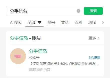 打开微信搜索栏,输入「分手信岛」,找到对应的官方服务号,点击进入即可。