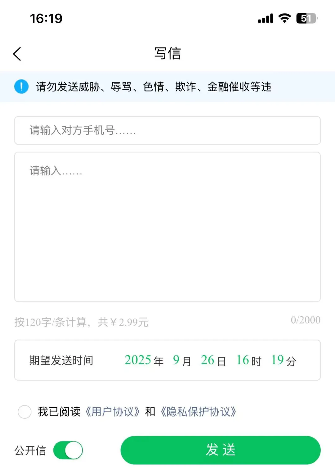 进入写信界面后,按提示填写对方的联系方式,然后在输入框写下你想传达的内容,表白、道歉、祝福、挽留…… 想说的话尽管写,字里行间的心意,由我们为你传递。