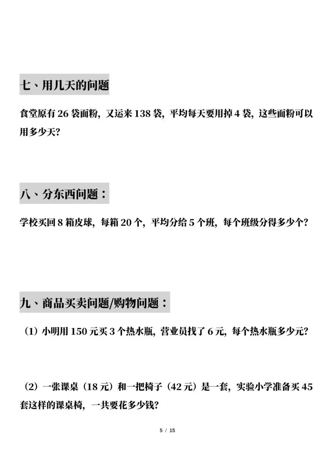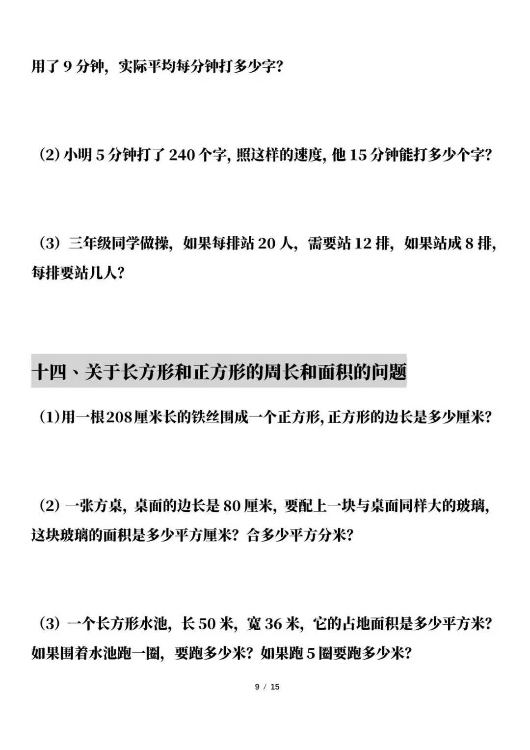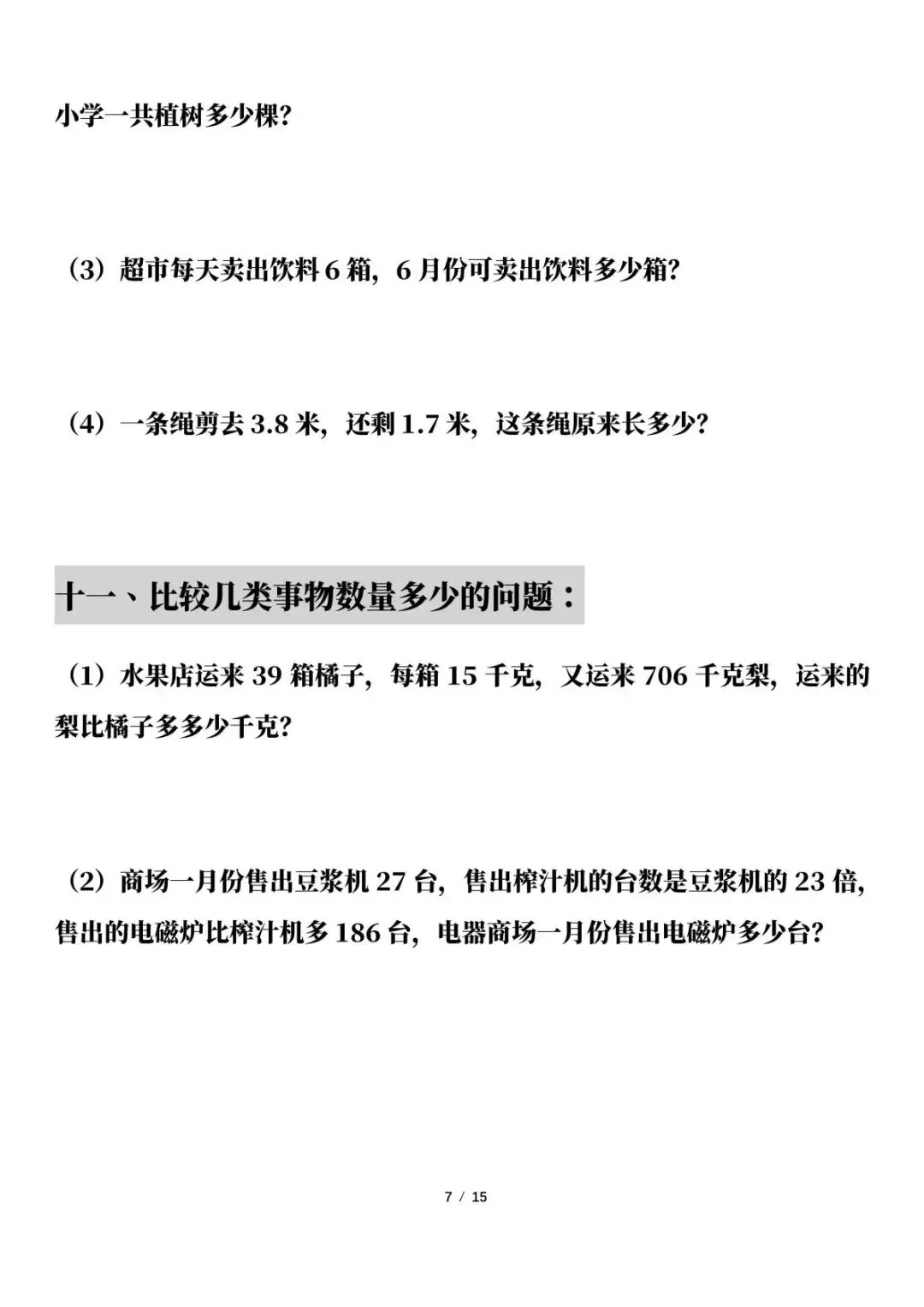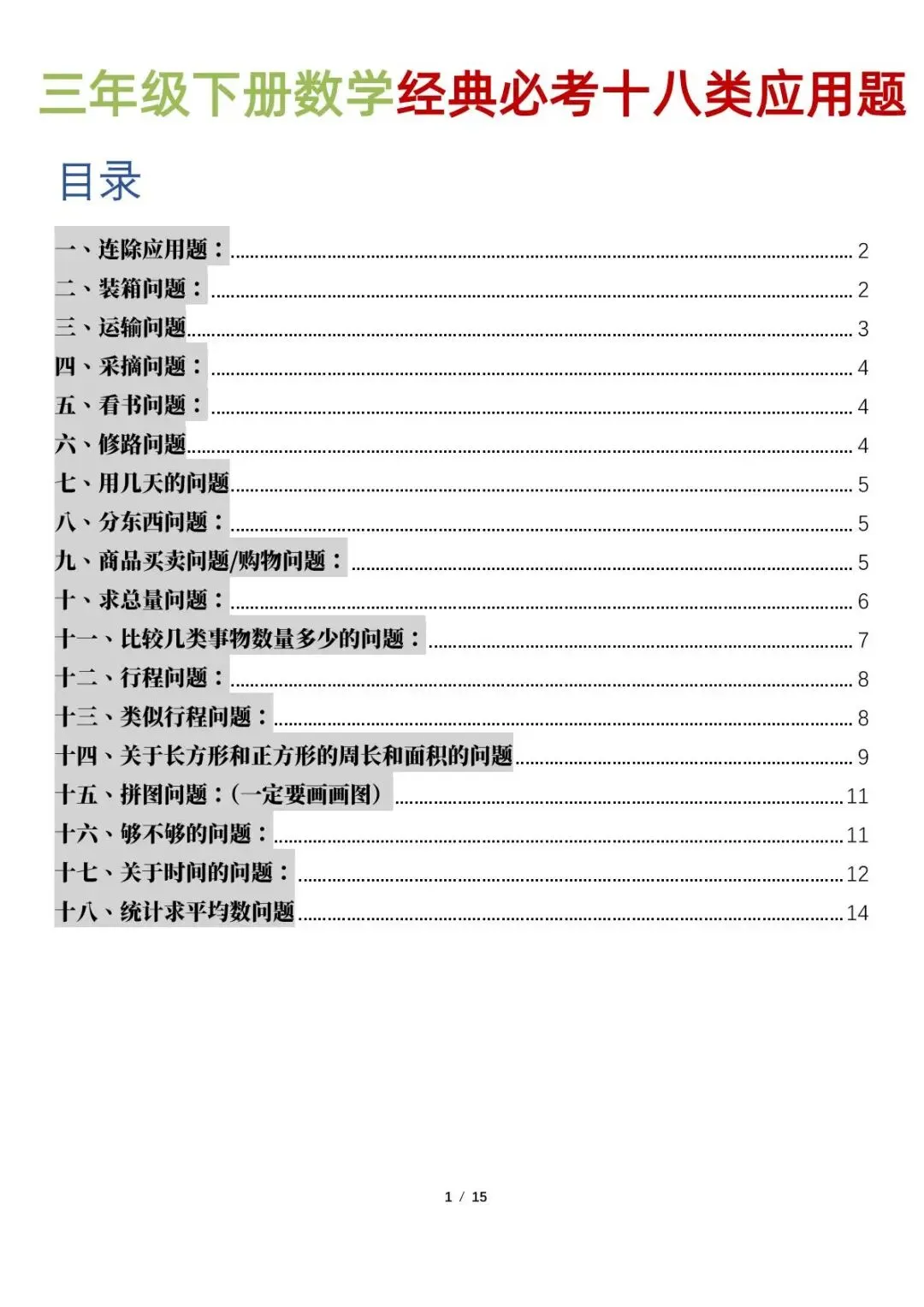 今天分享的是三年级(下)数学 经典必考十八类应用题 可下载打印(拉至文末,点击“阅读原文”,可直接下载完整可打印版。)