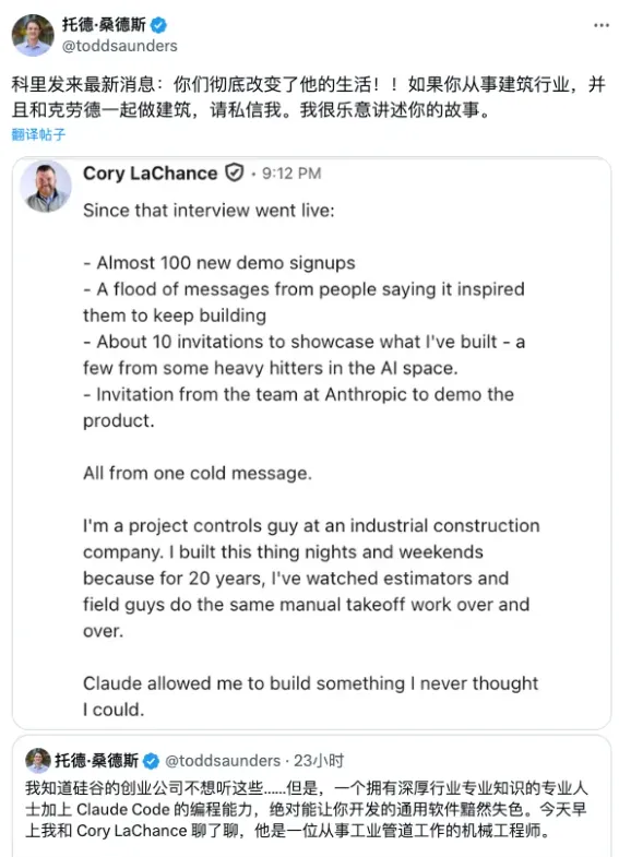 更让人震撼的是,开发者 Cory 从零开始,一边跟着 AI 学习 Claude Code、终端操作,一边独立完成工具开发,全程几乎没有外部帮助。这彻底打破了 “做 AI 工具必须懂编程” 的固有认知,也印证了一个重要趋势:建筑行业的 AI 壁垒,早已不是技术,而是行业经验。如今的 AI 工具,早已能通过自然语言交互实现无代码开发,只要你懂现场、懂业务、能把日常工作中的痛点和经验,拆成可执行的流程、转化为 AI 能理解的逻辑,就能做出专属的生产力工具。