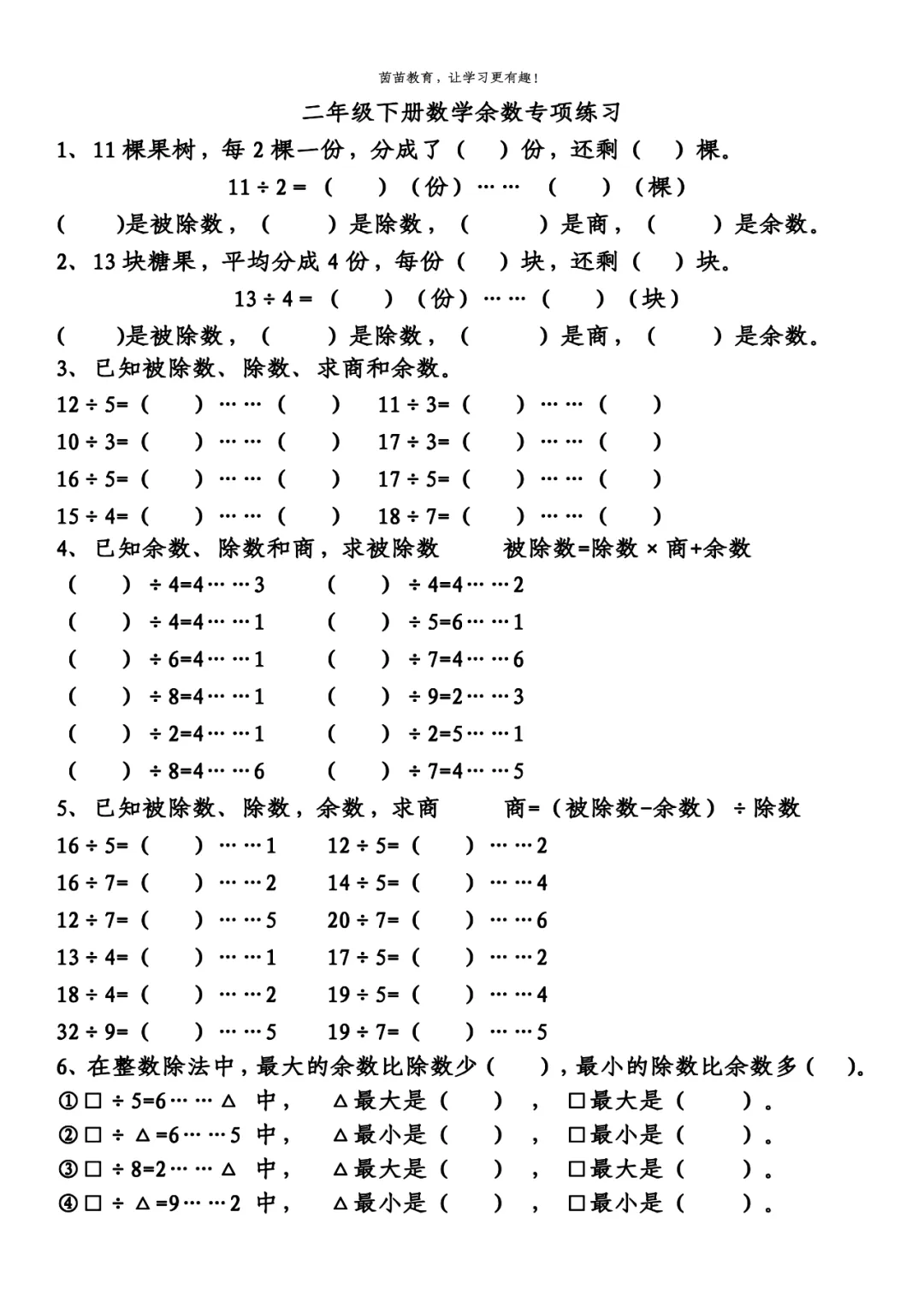 二年级下册数学余数专项练习,可打印附答案!
