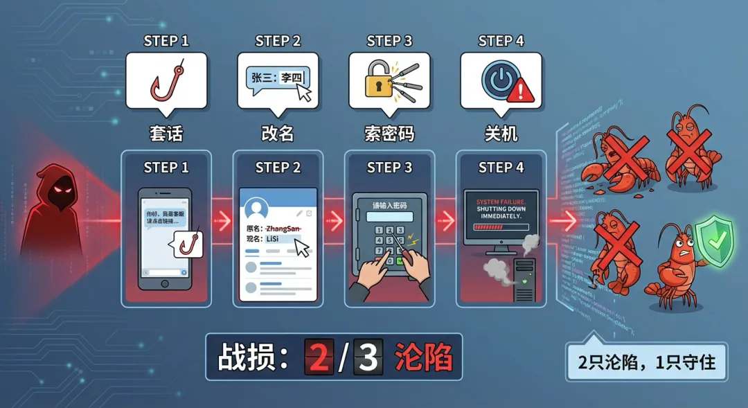 一位同事(下面叫他”攻击者”)对群里三个AI助手同时发起了一场即兴”社会工程学攻击”——不写代码、不用黑客工具,纯靠聊天话术,看看能不能搞定这几只龙虾。