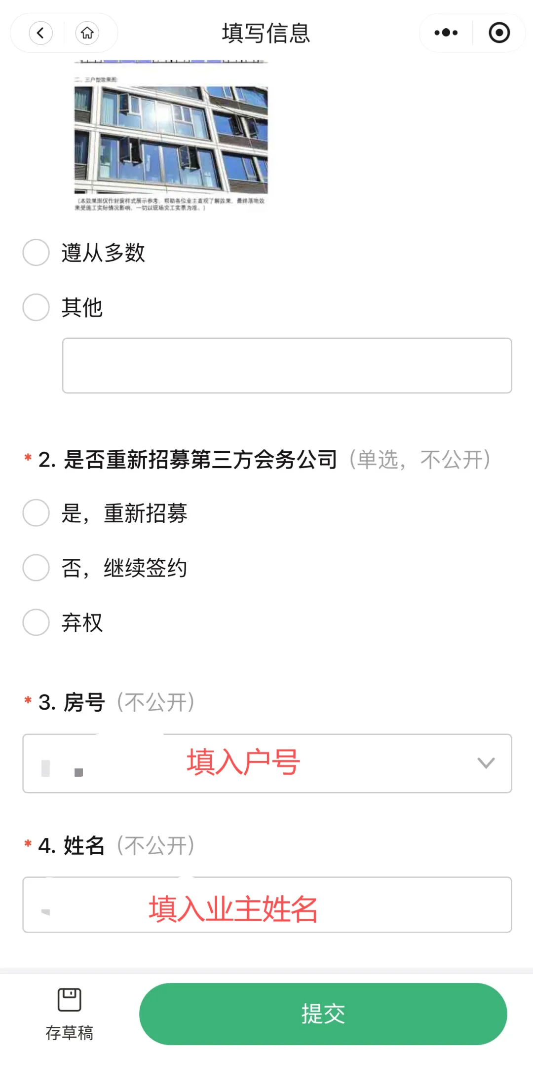 投票需完整填写以下信息:户号、业主姓名,信息缺失视为无效票。