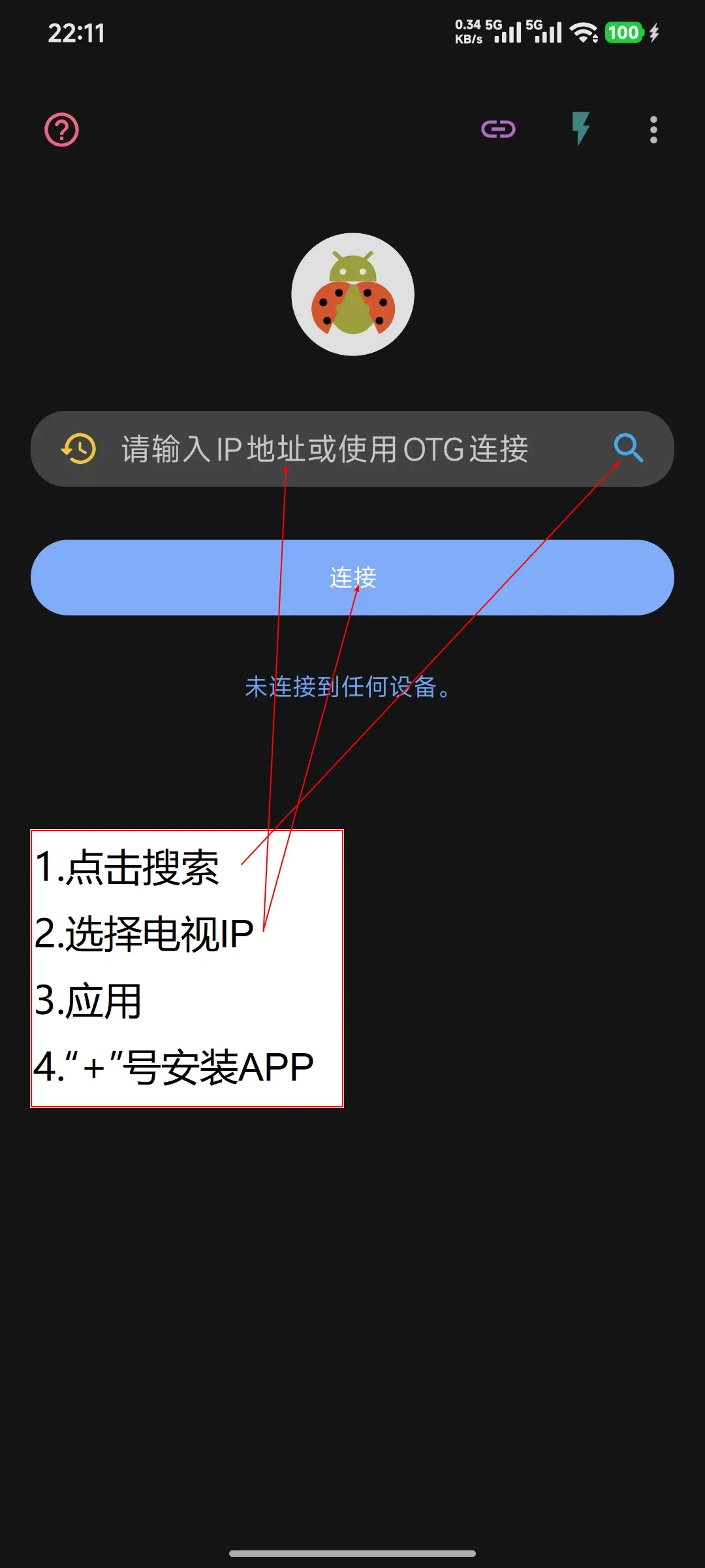 方式2:手机安装“甲壳虫ADB助手”,并打开电视ADB调试模式,保持手机与电视在同一个WIFI,甲壳虫连上电视IP后,在“应用”安装APP,在“文件”把解压后的本地“源”放置到安卓电视文件夹的主目录下。